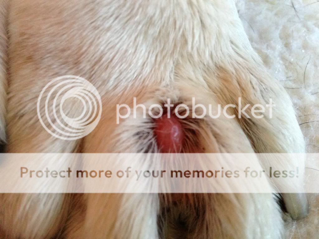 Just found this on Sally tonight. I found this thread that will help out quite a bit. Reoccuring interdigital cyst. From what I understand reading that thread, it's food related? She had hard boiled eggs recently and last night. The only other thing I can think of is this week she has as new canned food: Wellness Core Beef, Venison & Lamb forumala. She gets a couple tablespoons mixed in her food morning night. Wonder if that's it? We had her 8 weeks plus now so I'm thinking it's it.