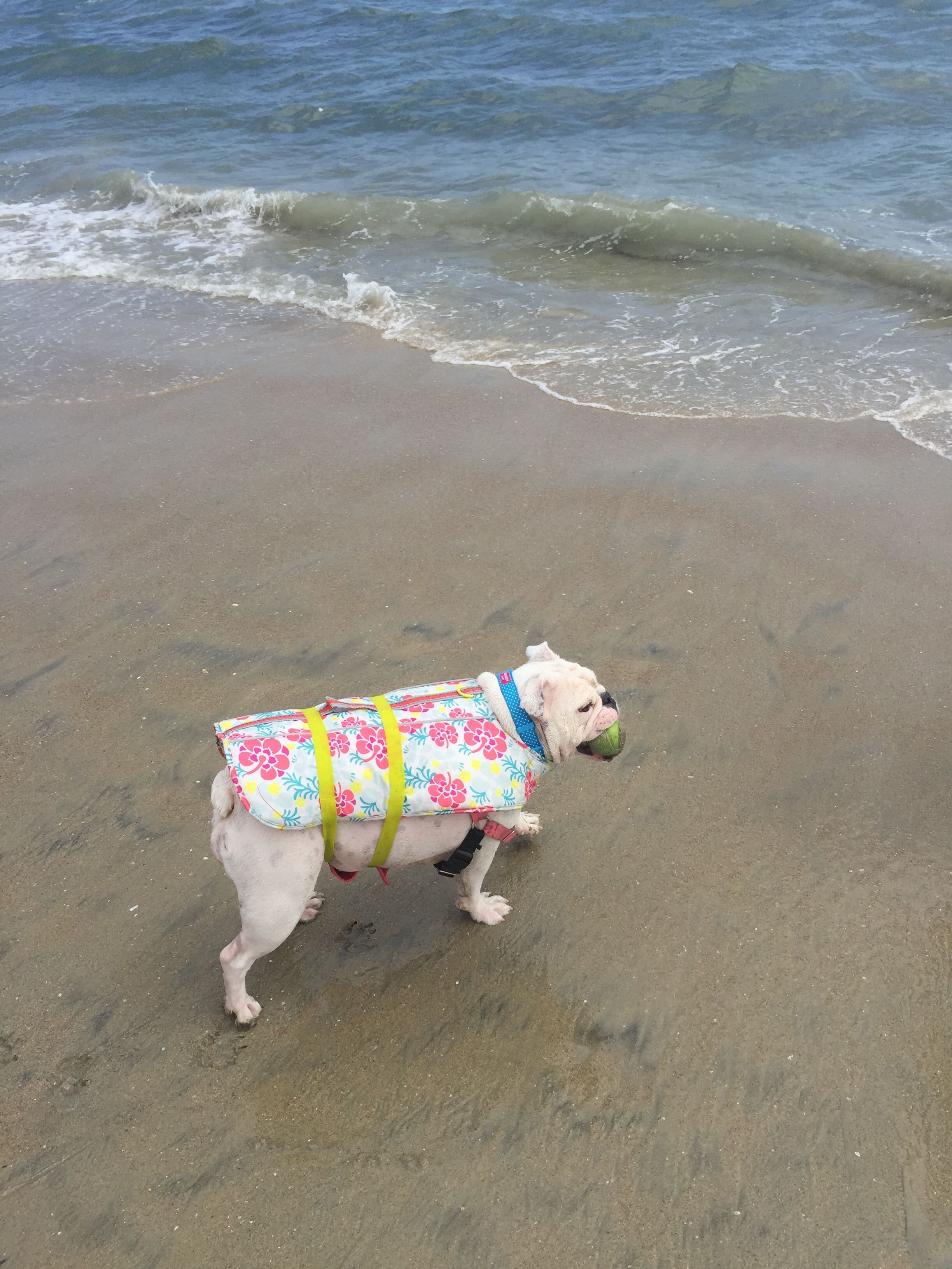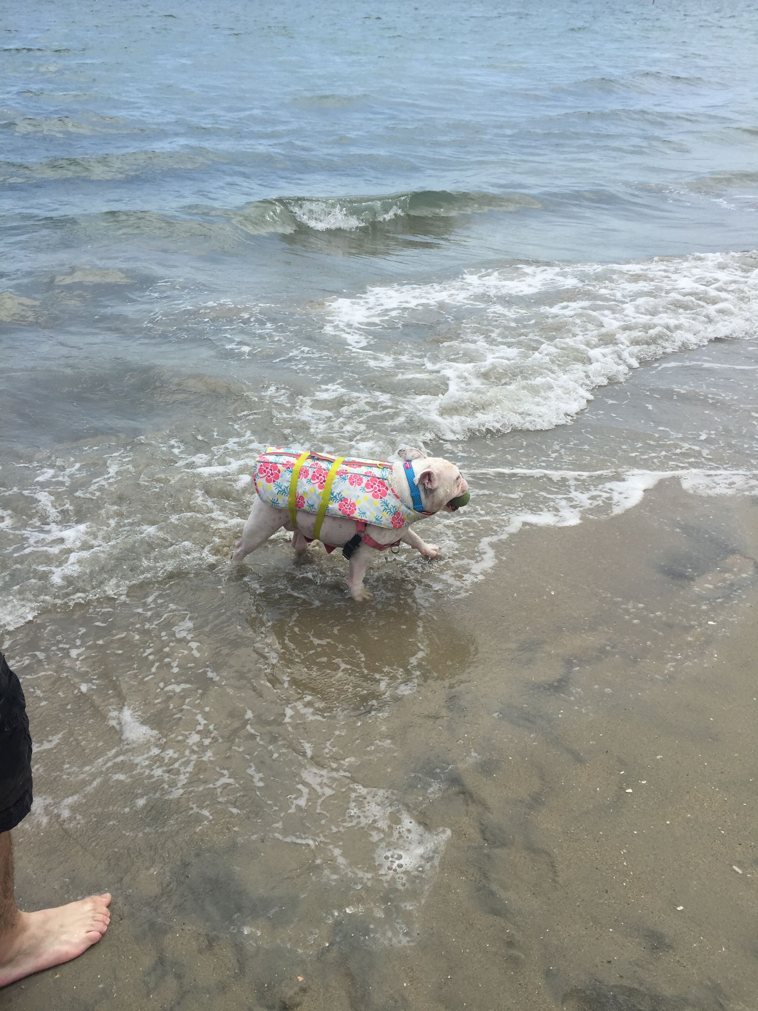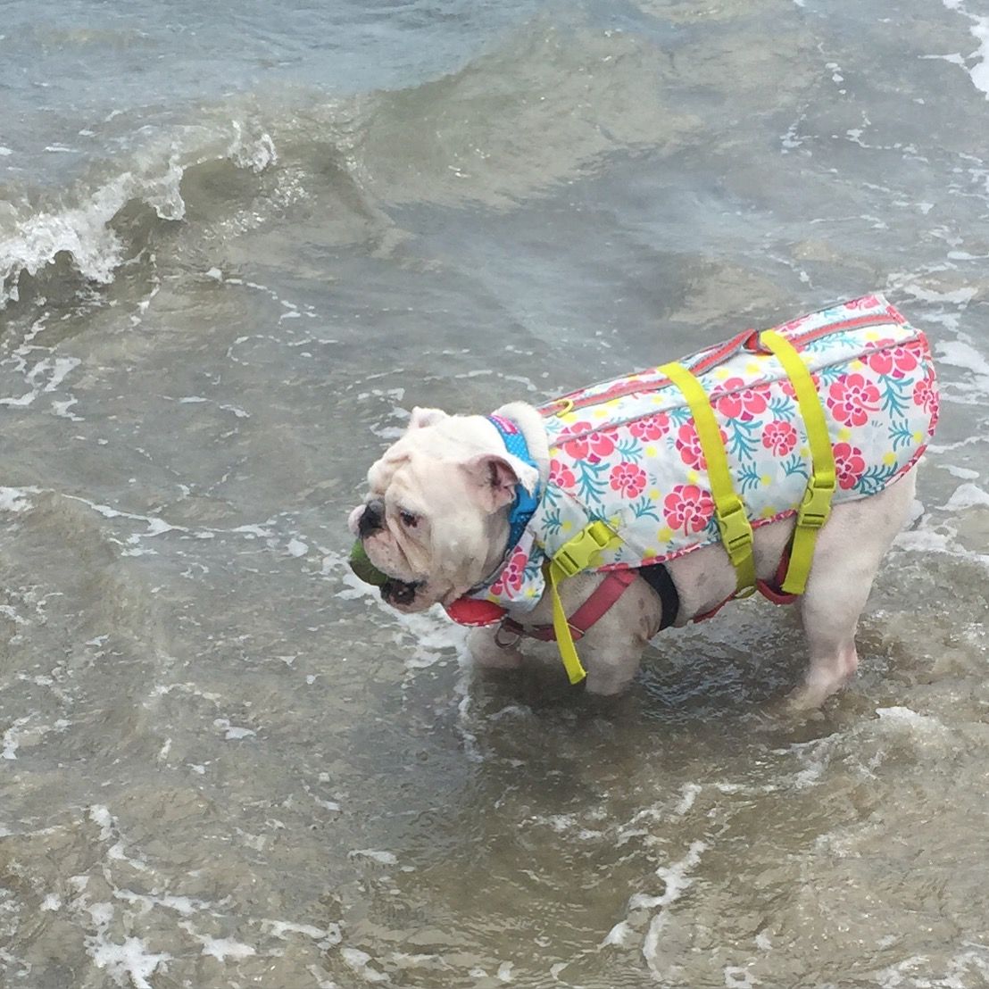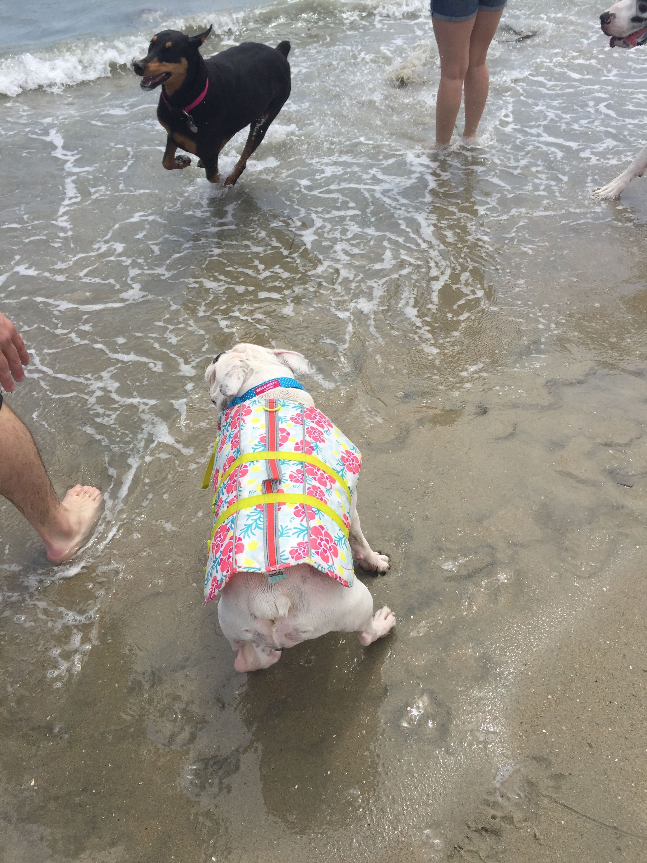 Get life jackets for your bullies. Most bullies cannot swim at all - Matilda doesn't even have the instinct to swim, as in, she doesn't even try to paddle in water. She will literally just sit there and sink. But she loves the water and likes to wade in, so life jackets are a great precaution. If they get in too deep or get nailed by a wave, at least it will keep their head up and buy you some time to intervene. There's also the added bonus of a wet life jacket will keep them cool and protect them from the sun!