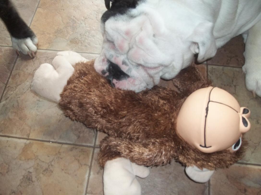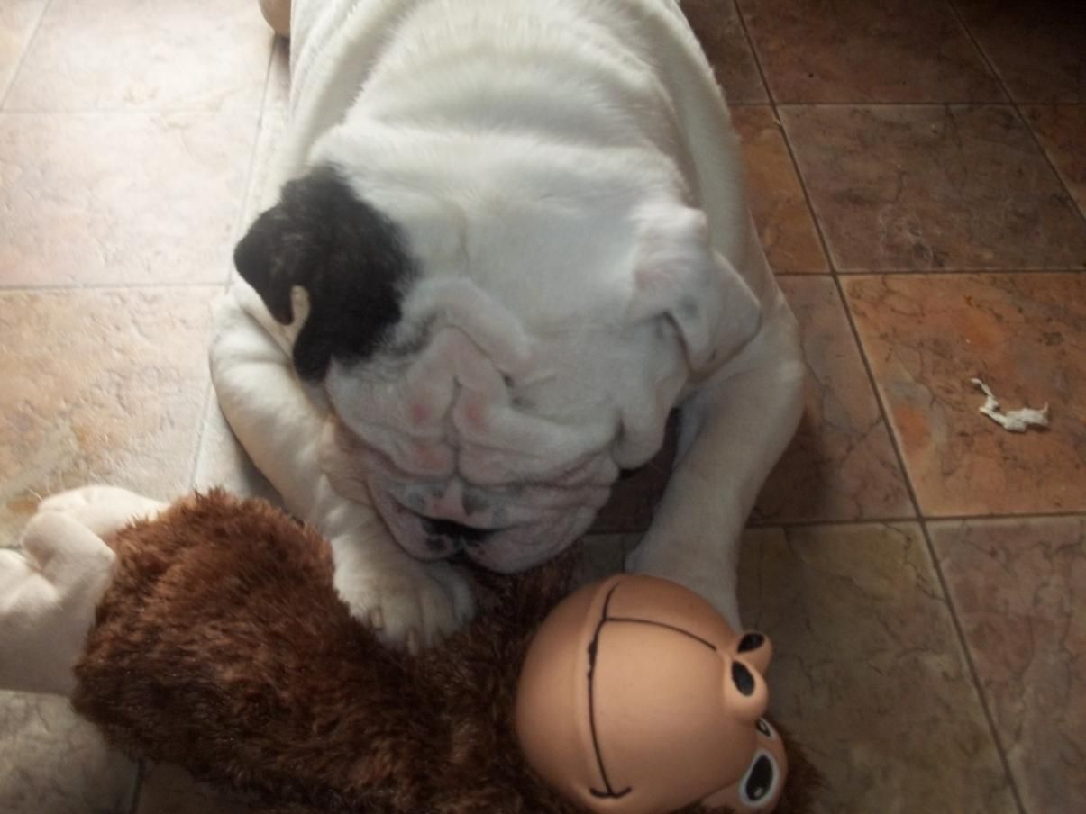 Okay, back from the vet and Oliver has double ear infections and his folds are infected from his eyes draining so much. So he is on his Mal-a-ket wipes for his folds twice a day, 20 mg of prednisone (tapered off), 500 mg Cephalexin 3 times a day for 14 days, 8 drops of Mometamax drops in each ear once a day for 7 days. So of course I had to buy him a new toy!