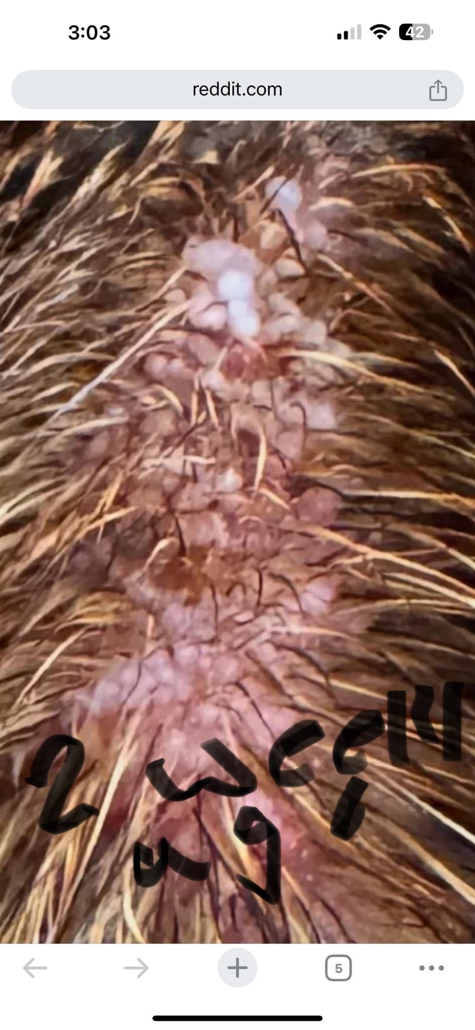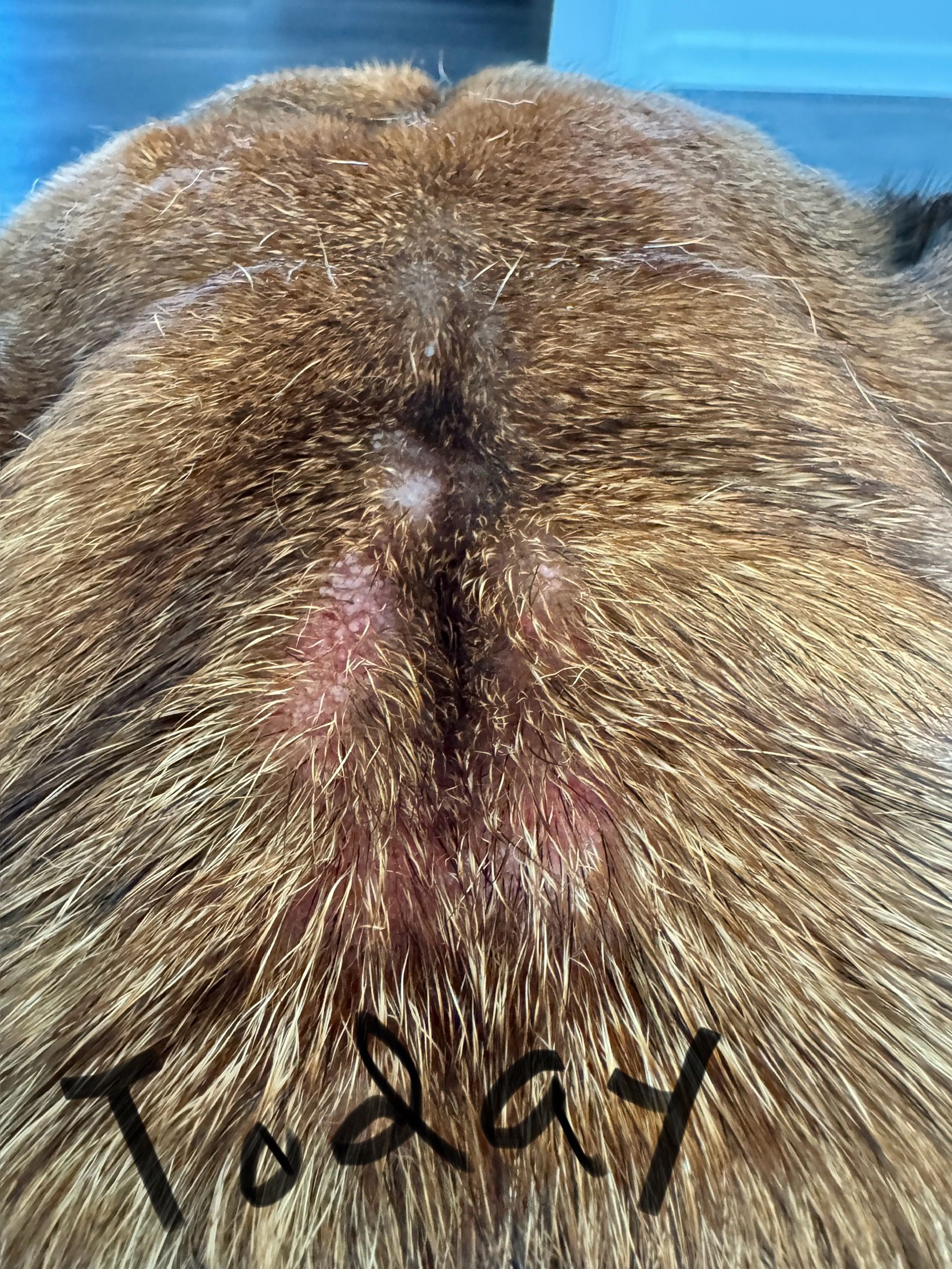 I started medication shampoo and it seems to have helped in the sense of taking down the size of them. They seem to scab up and fall off. The reddish look seems like irritation so I apply coconut oil so he doesnāt itch.