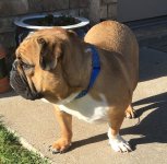 My first thought was that his face looked like a pug as well and his legs do look shorter, but I agree with others comments that he is a beautiful boy, and EBs come in all different shapes, sizes, and features. He's beautiful, and you love him, that's all that matters. People ask me all the time if my Bulldozer is mixed with a Boxer? I know he has a defect in his jaw, it is longer than normal, and he's congenitally missing his lower molars. It doesn't affect him except he eats slower, and he can't close his mouth completely, so his tongue always hangs out. It doesn't matter to me, I love him no matter what.