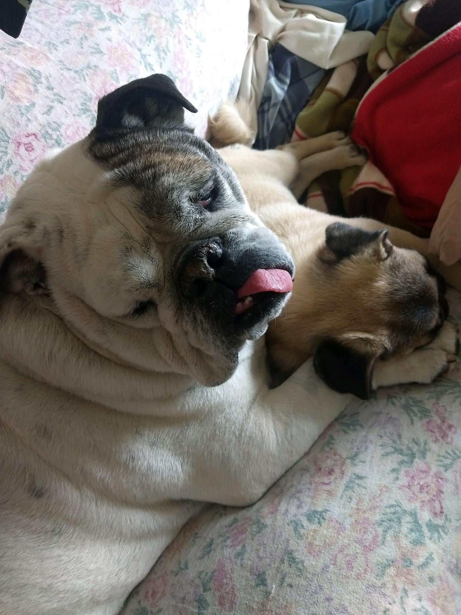 Manydogs Well-known member Community Veteran May 2, 2013 13,712 2,216 Tennessee Country U.S.A. Bulldog(s) Names Maudee,MarthaKatie,Lizzie,Bro.Mini Jul 2, 2018 #3 Awww, Bacon, you are such a good boy! What a sweet picture,he's taking care of his little sis.
