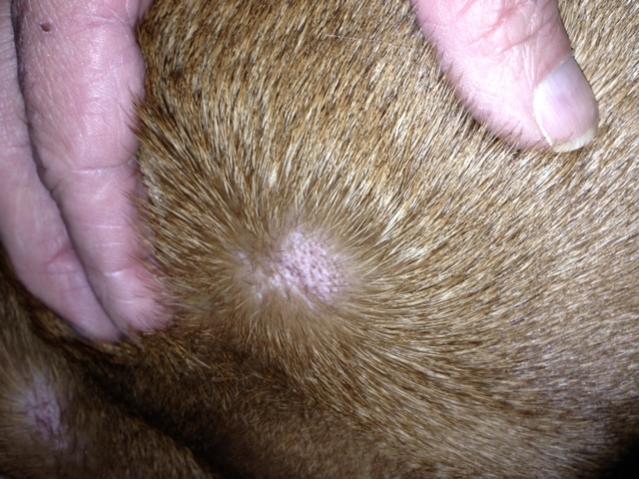 I just noticed 2 of these spots yesterday on Tater. One on his neck and this one a little farther down his back. He did just have a bath a couple days prior but hasn't had reactions in the past. He eats Blue Buffalo Wilderness but has been since he was brought home, he'll be 9 months old next week.