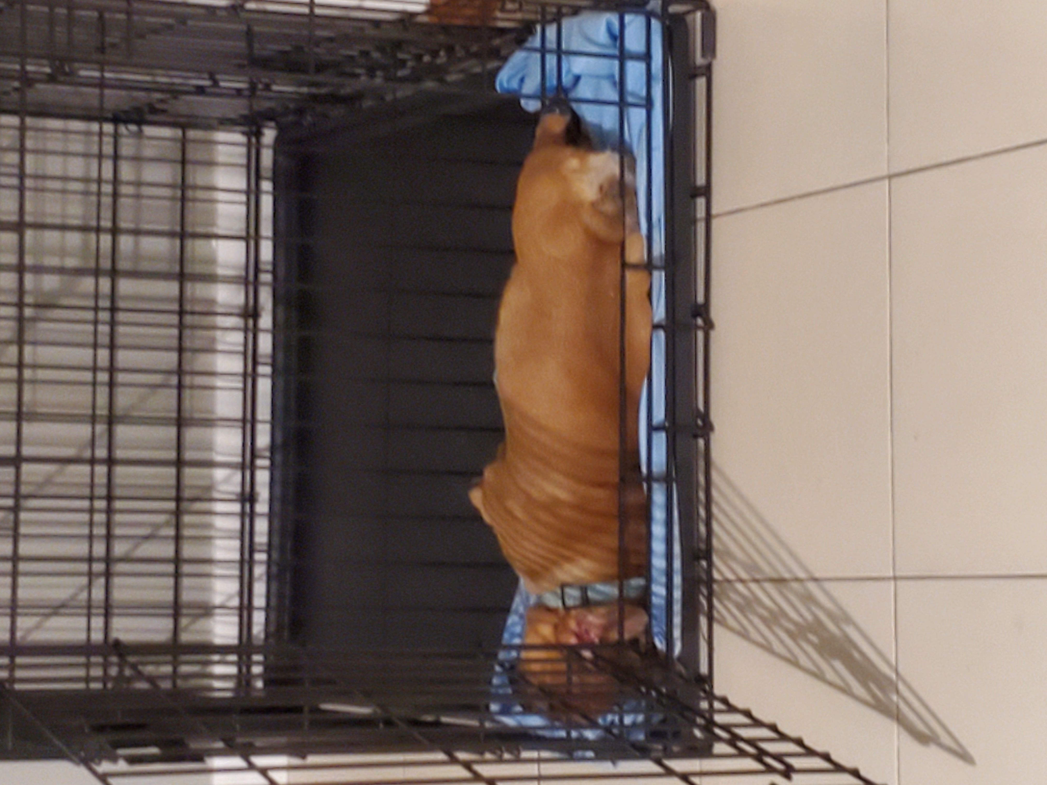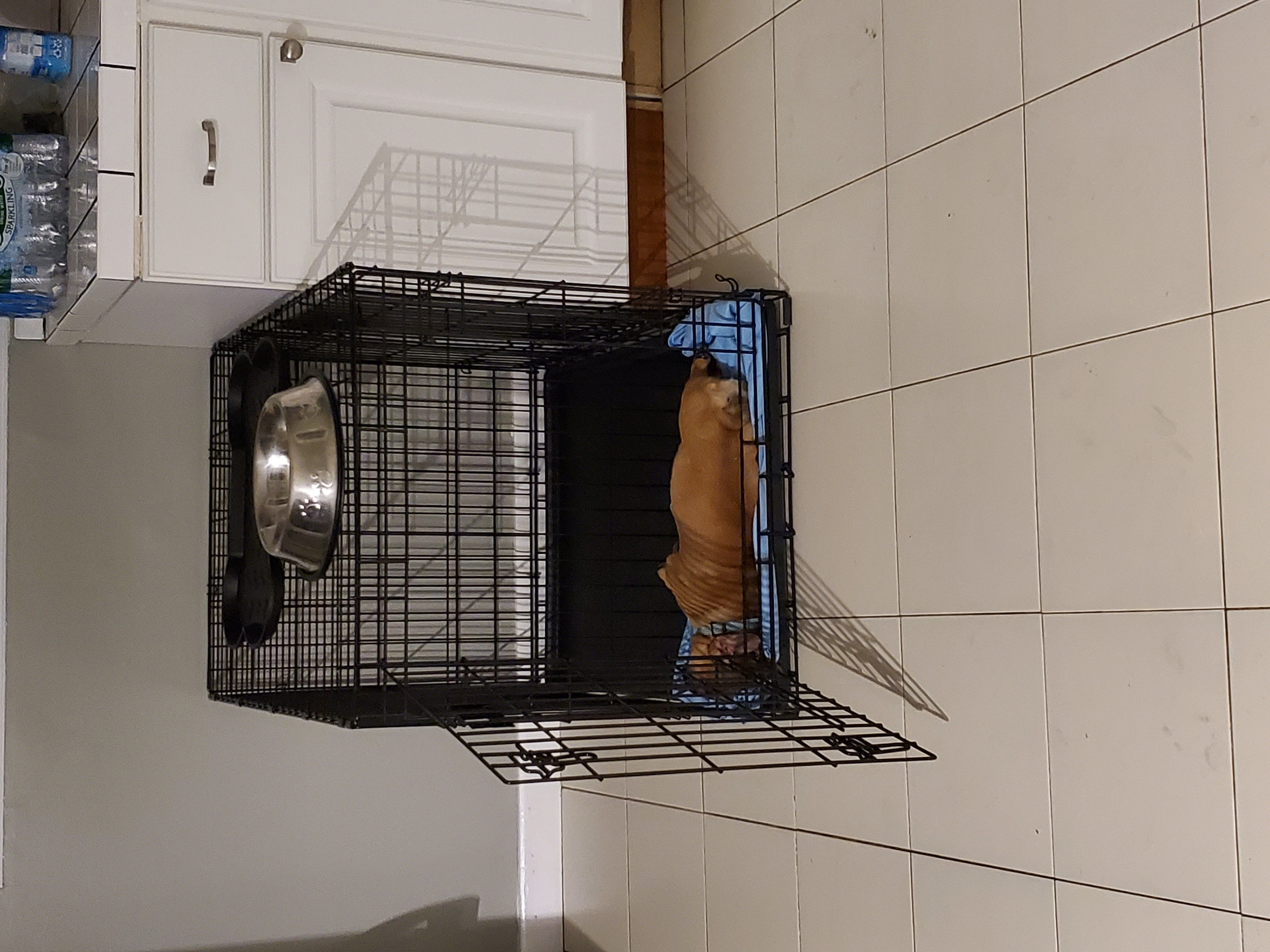 After a week of feeding Mocha in the cage for all meals, I got this on Monday! Small step forward. Starting Monday after she goes out at 8PM she comes right in and goes in her crate and goes to sleep...well she starts there. She comes out eventually and sleeps all over kitchen. I crate her for the evening after I take her out at 11 pm. I stopped trying to crate for short periods during the day. She is confided to the kitchen and only having 1 or no accidents a day there. I am going to slowly work on the crating during the day but I am taking this one!
