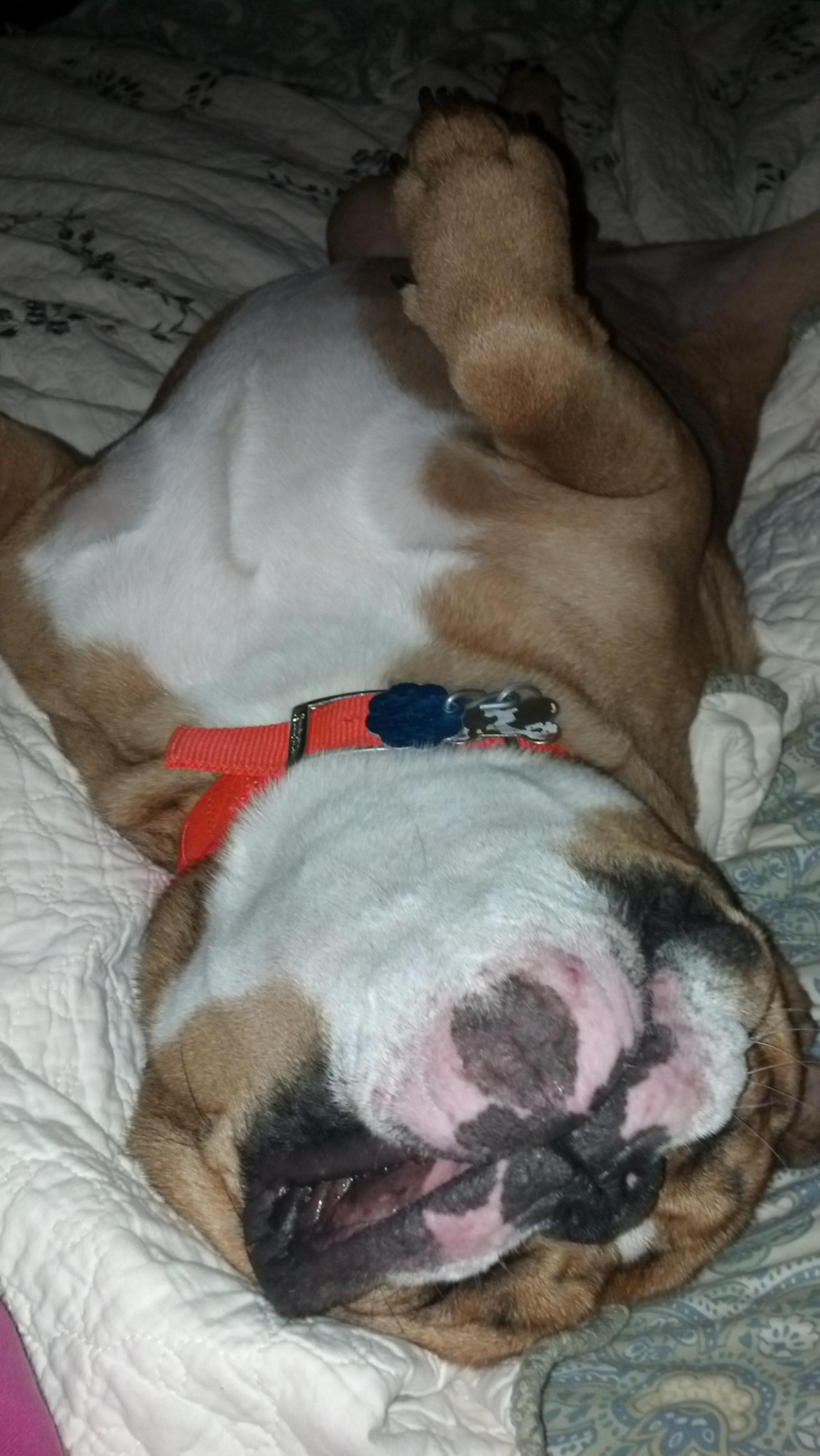 Tank will sleep only on our bed.. thought I'd share a few pics of him hogging the bed these past couple of nights. Do any of you have a bed hogger as well? :D Sorry for some are blurry phone pictures! The very last picture is him sleeping with his chin on my arm... he does this every night until my arm goes numb