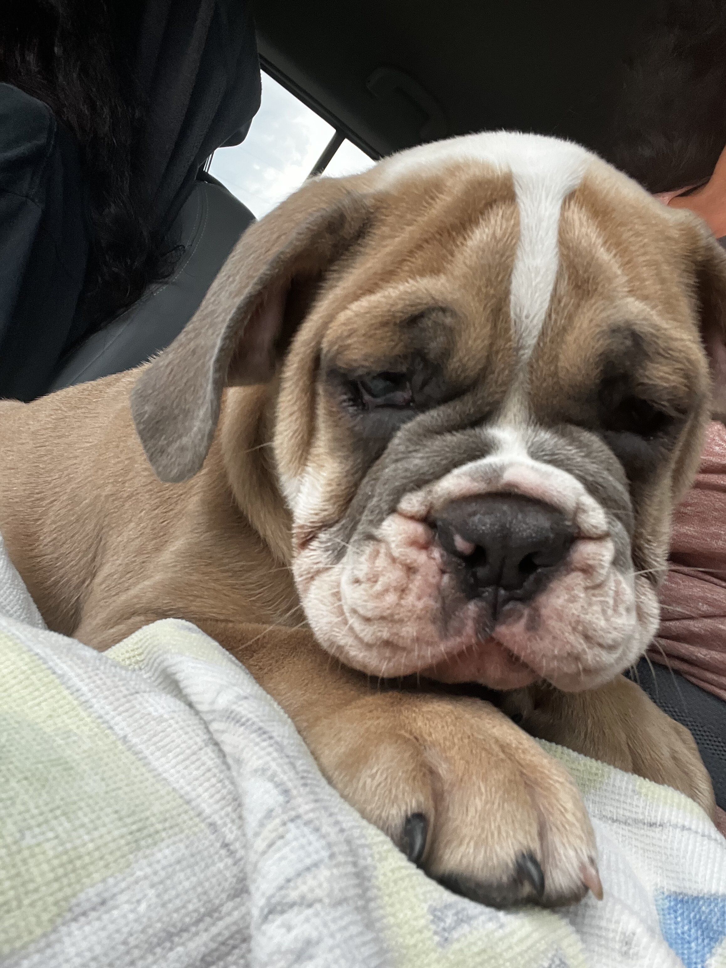 The fawn is ours the grey one is my is my daughter’s. 10 week old olde. English bulldogs!