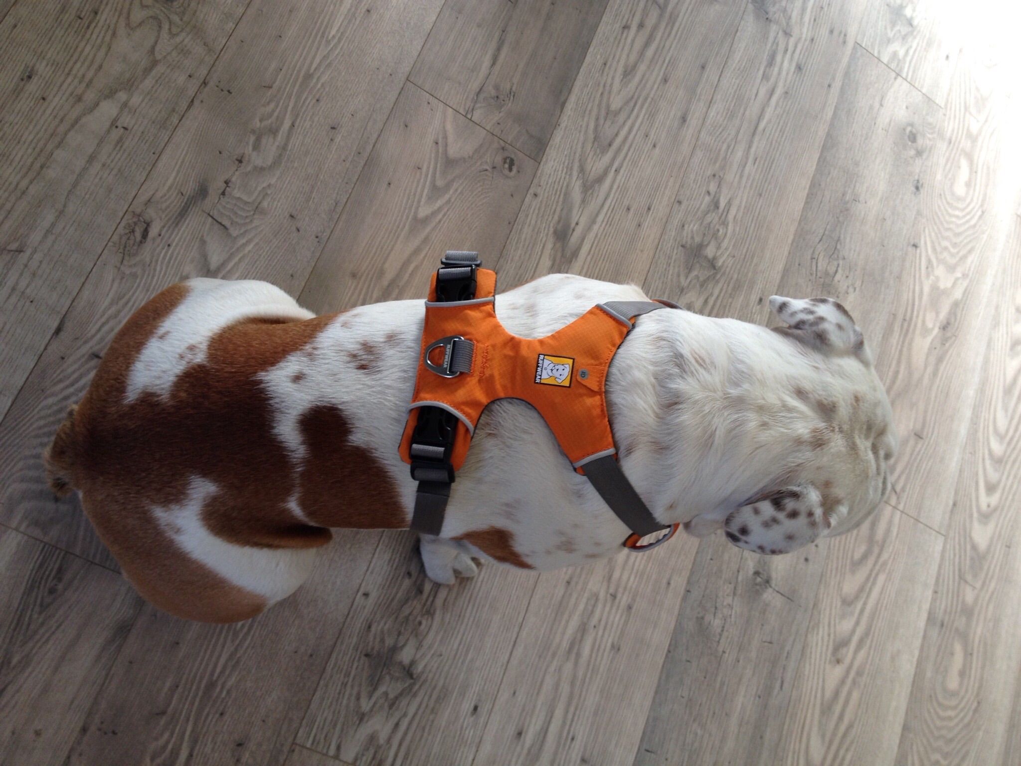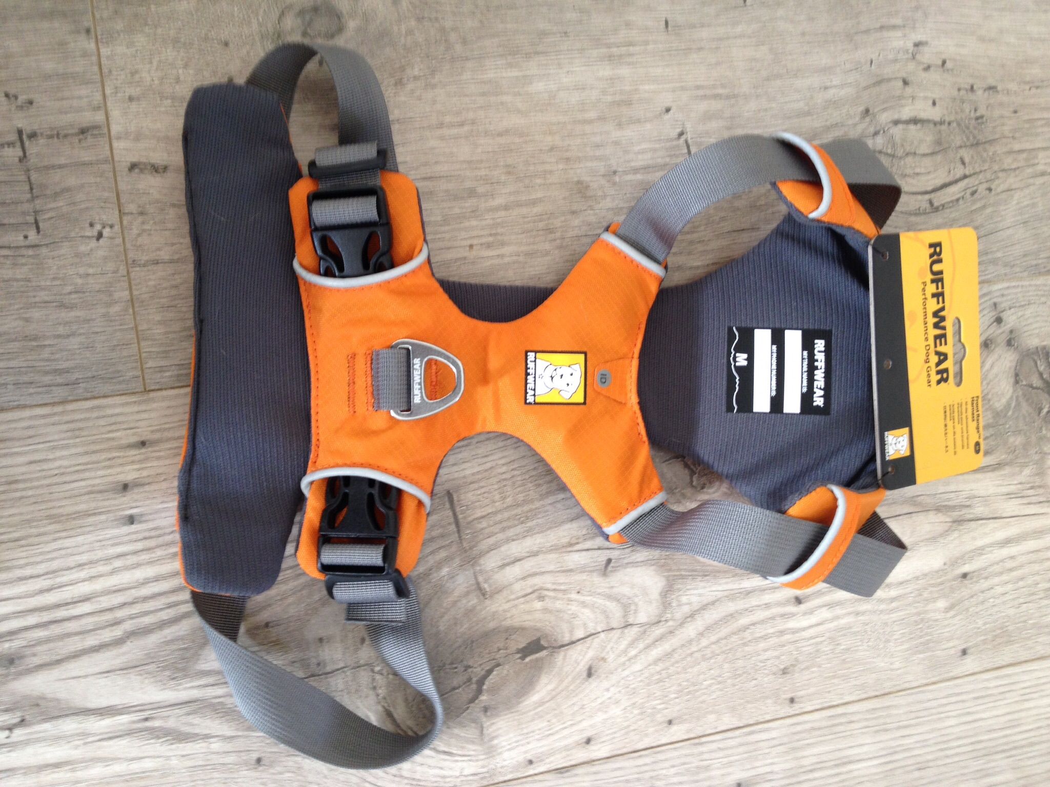 It's the new harness from Ruffwear. It looks good and is adjustable at the chest and waist.. it's padded, has reflectos strips, it has a pocket for the dog's ID tag and has two leash attachment points to clip the leash- one at the chest and back. the only thing missing for me is that it doesn't have a handle like his Ezydog harness so i can easily grab him. Also one drawback is you need to clip it on both sides unlike his very easy to wear Ezydog. BUT it looks good lol and looks more durable.