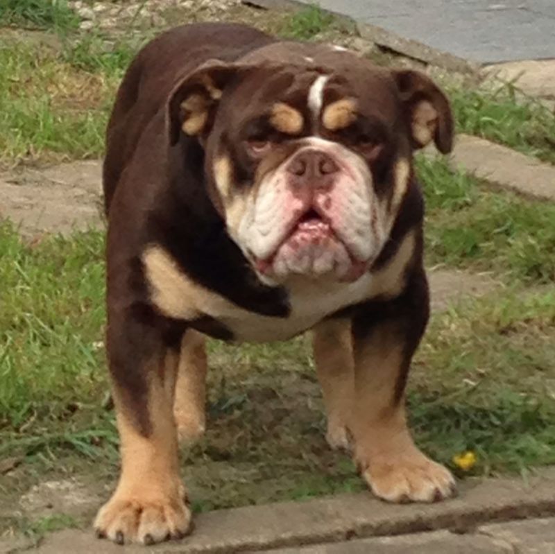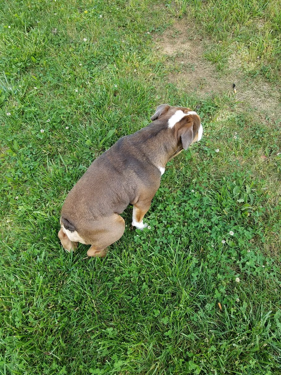 Here is a picture of his back which lets you see his coat better. I apologize for the peeing picture, but it was one where he could actually stay still for a few seconds. I also am attaching a typical chocolate tri bulldog photo which I believe he does not look like. @Biscuitsmom @RiiSii @bullmama @2BullyMama View attachment 98270View attachment 98271