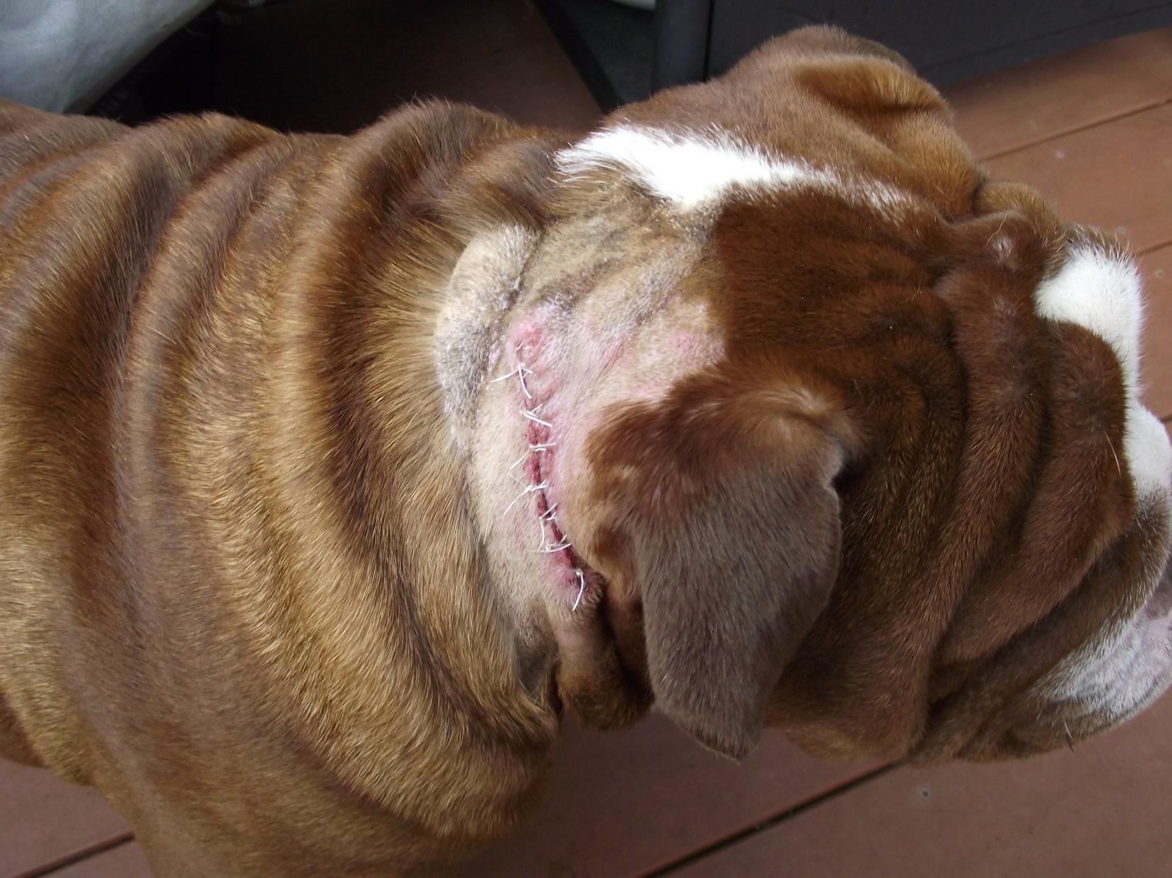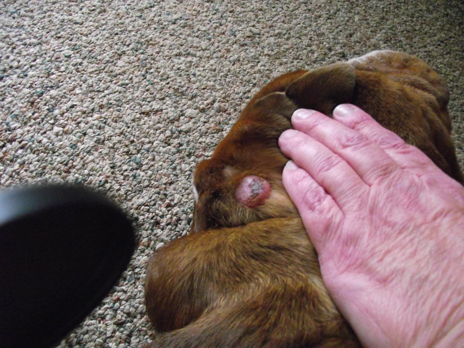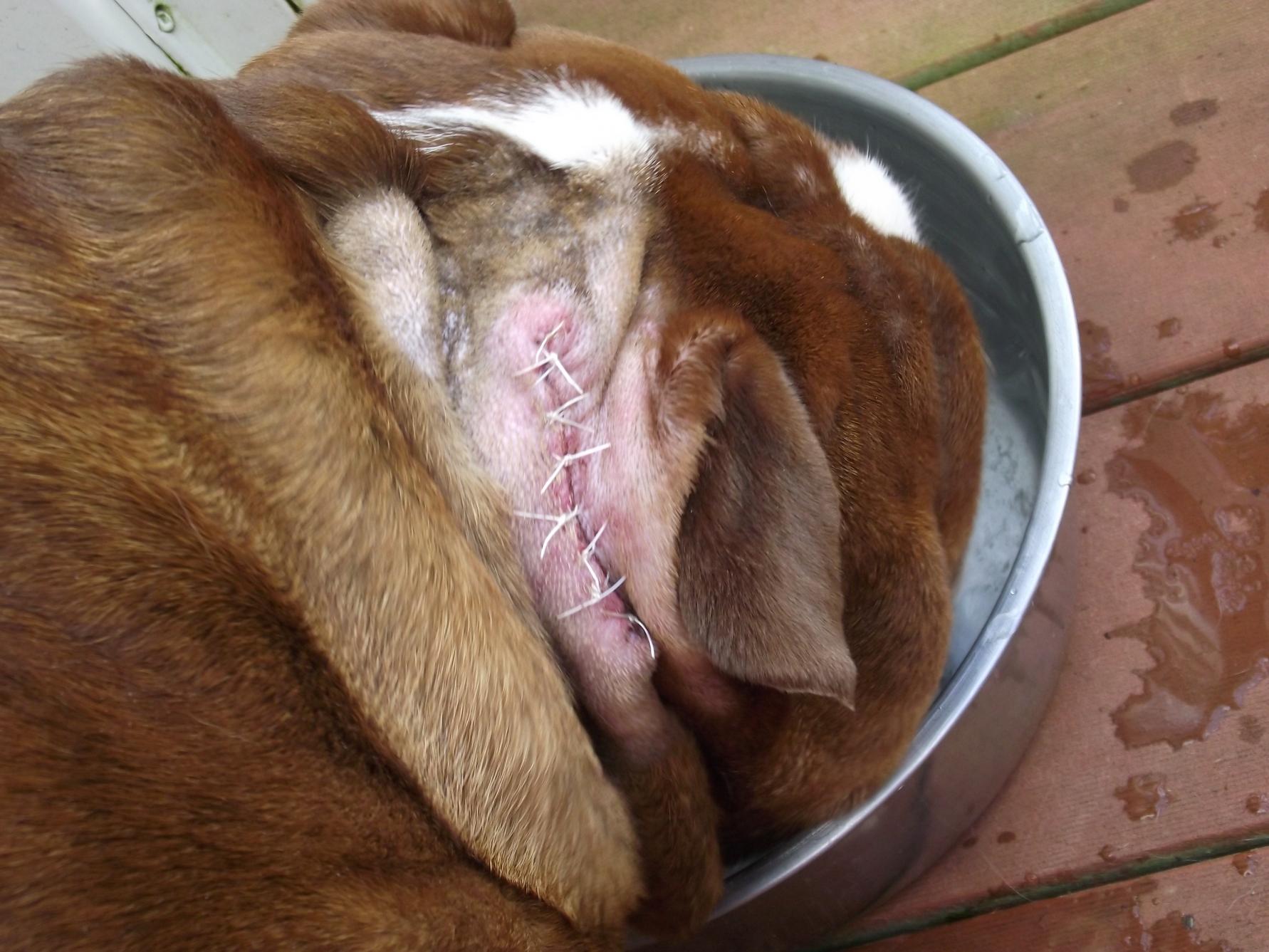 That's blood on her face. She likes to get her favorite chew toy in her mouth and shake her head vigorously! I think this is what started the bleeding yesterday and then it got worse.