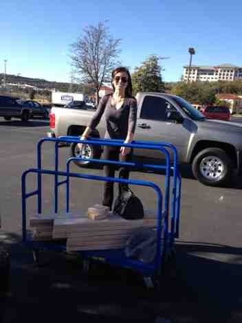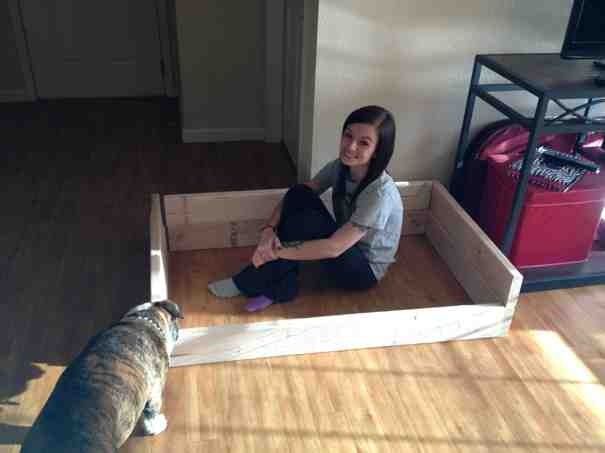 Me, very excited about our supplies and getting started! The Pinterest post uses a pallet that gets taken apart (we didn't have room for a pallet or supplies to saw it apart), so we bought the wood. We made up our own dimensions, which turned out to be WAY bigger than intended. But oh well, more room for the dogs to roll around on!