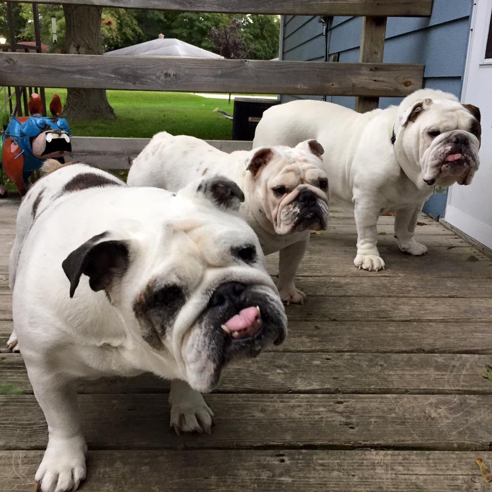 Small, medium and large white bullies (L to R - Lola (visitor), Miss Daisey, and Sir Winford):