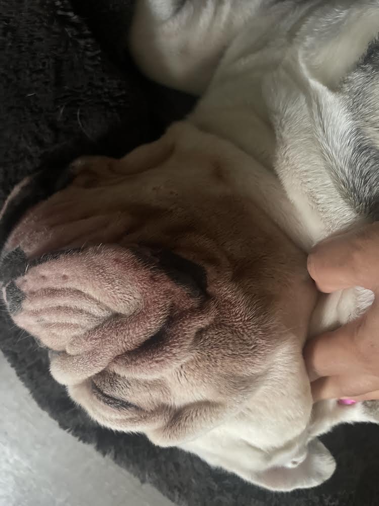•HOT SPOTS - Hot Spots are not fun. They are painful and itchy, and they can grow and spread at a rapid rate. If you find a hot spot on your Bulldog, you MUST act as quickly as possible and try to dry it out to keep it from spreading. If you have an electric shaver, shave all the hair off the entire area until you find good skin surrounding the hot spot. The most important thing you will do after this is to wash the hot spot with Hybiclens or an antibacterial soap several times a day. This can take care of the hot spot but remember, Hot Spots itch very badly. Putting a type of self-drying steroid is the best option, so if you have any Malacetic Ultra on hand this works really well. If not, use whatever type of astringent you have on hand, including, Witch Hazel, Douxo, Malacetic Otic, Hydrogen Peroxide or even (yellow) Listerine. If the area is super itchy you may need to give some relief by putting any kind of hydrocortisone cream on it, rub it in really well so it does not keep the area moist! It is important to keep them from licking or itching the hot spot, if you must use a cone or clothing to prevent them from getting to it please do so. Recently, many have started using Vetericyn spray with success when treating Hot Spots.