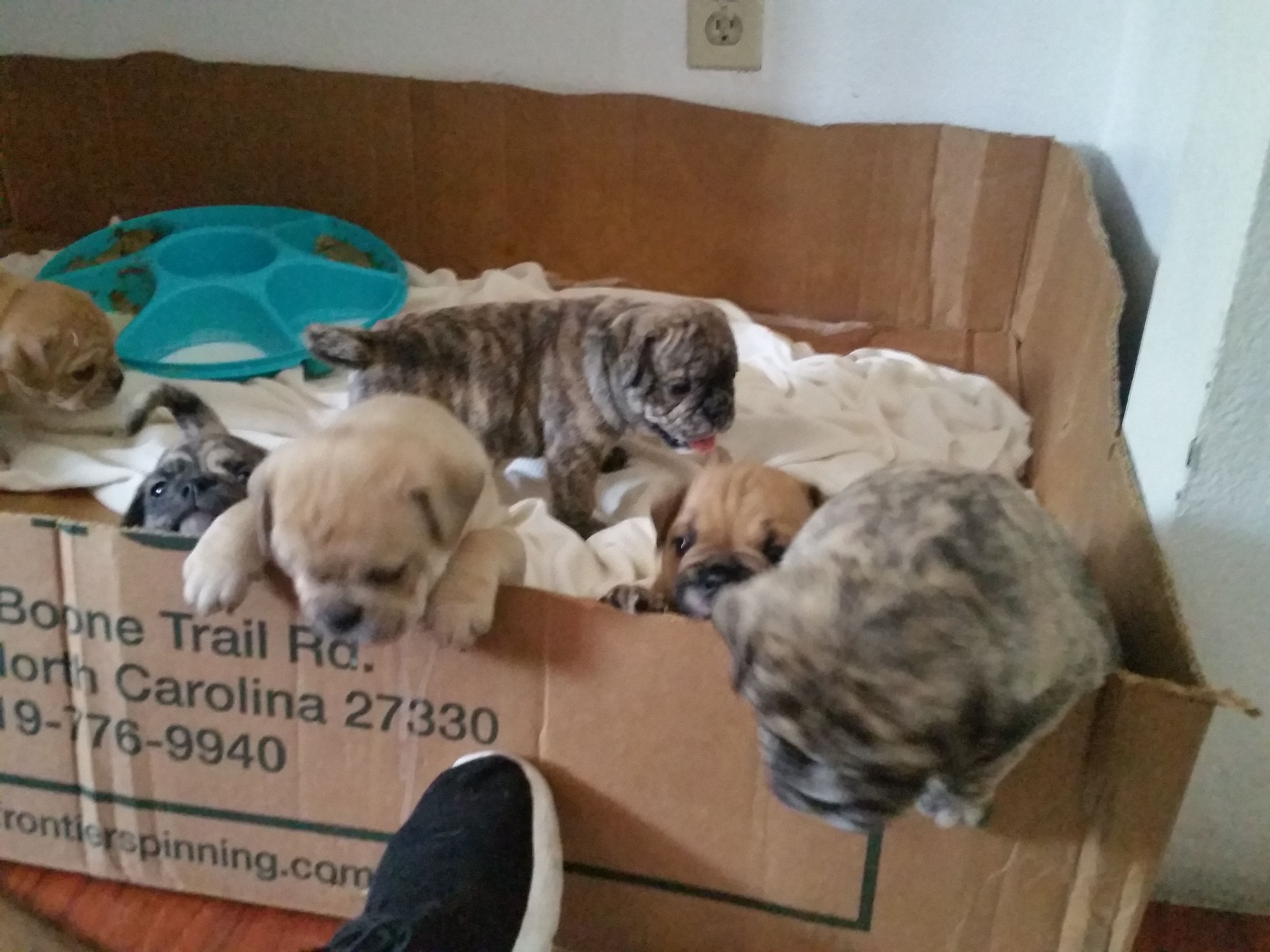 Anyhoo I was just using my phone to try to see if you had posted any recent pictures but here they are and thank you!! so cute. Love the brindle and the fawn too....genetics is so amazing sometimes. They look like they will be healthy (good snout length) and happy!