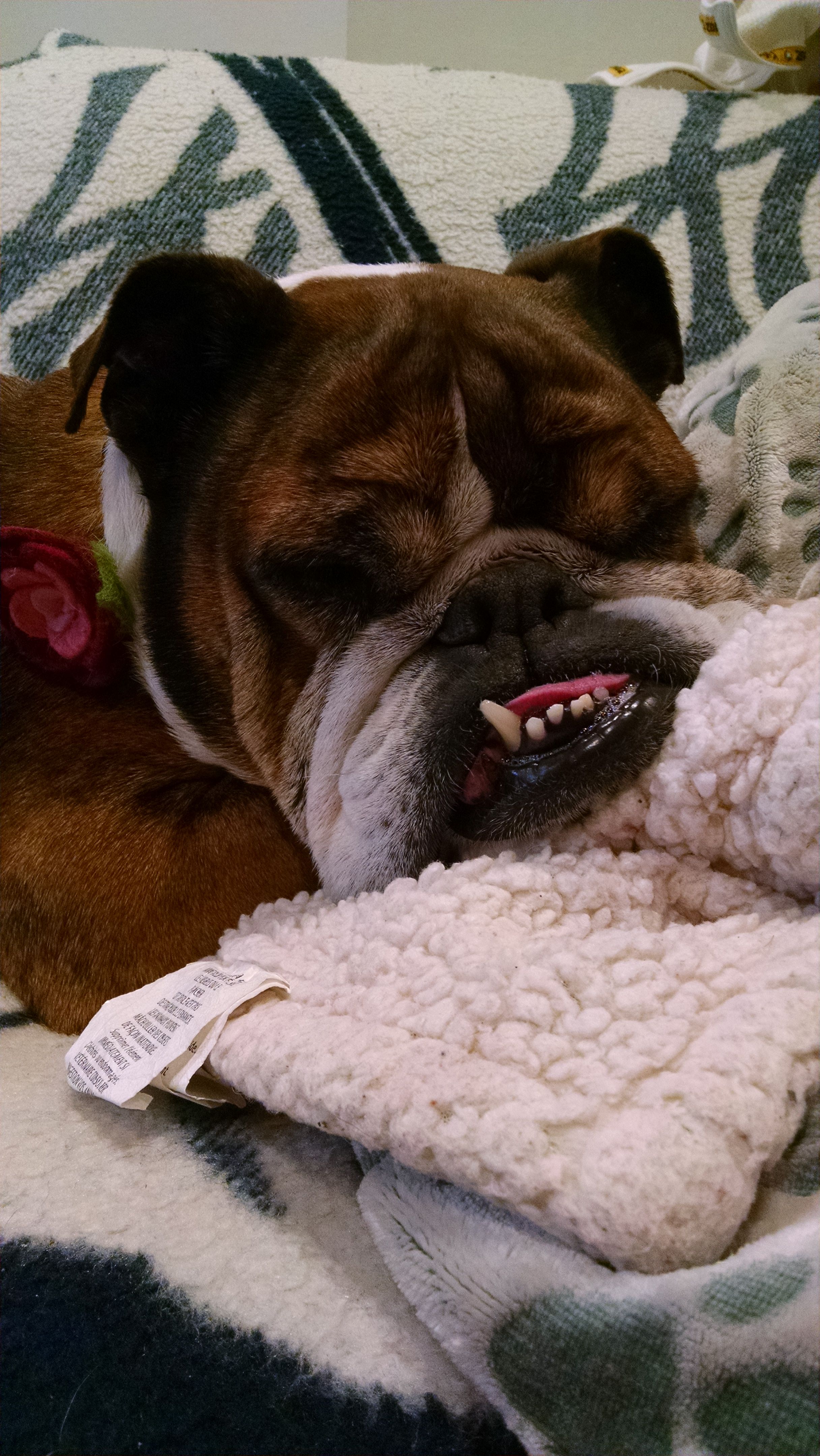 Regular baths with special shampoo have kept this lovely girlâs coat (and cute folds) itch-free! A small daily dose of Apoquel helps as well. Foxie is housebroken but does wear a diaper due to a rectal polyp which causing some bleeding, in addition to occasional involuntary urine leakage. Her small rectal polyp will pop out during a bowel movement or from excessive barking. When this happens, a small amount of blood trickles out and needs to be wiped. Also, the polyp needs to be pushed back in to prevent threat of infection. (She wears a diaper in the house 24/7 and is fine with that.) After each bathroom break, she should be wiped.