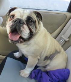 Gizmo is an almost 4-year old English Bulldog and weighs in at around 50 lbs. He loves to sit right next to his human & rest his head against your lap. Be careful because he may occasionally give out slobbery kisses. He is as active as most English Bulldog, which is not a lot. Gizmo does, however, like to go to the park to sniff the trees & bushes. He is not a big fan of riding in a car, but if he does have to ride, he prefers to ride shotgun. His foster family is in the process of getting to know Gizmo, but so far he is getting along well with others. Please keep watch, because Gizmo should be available for adoption soon!