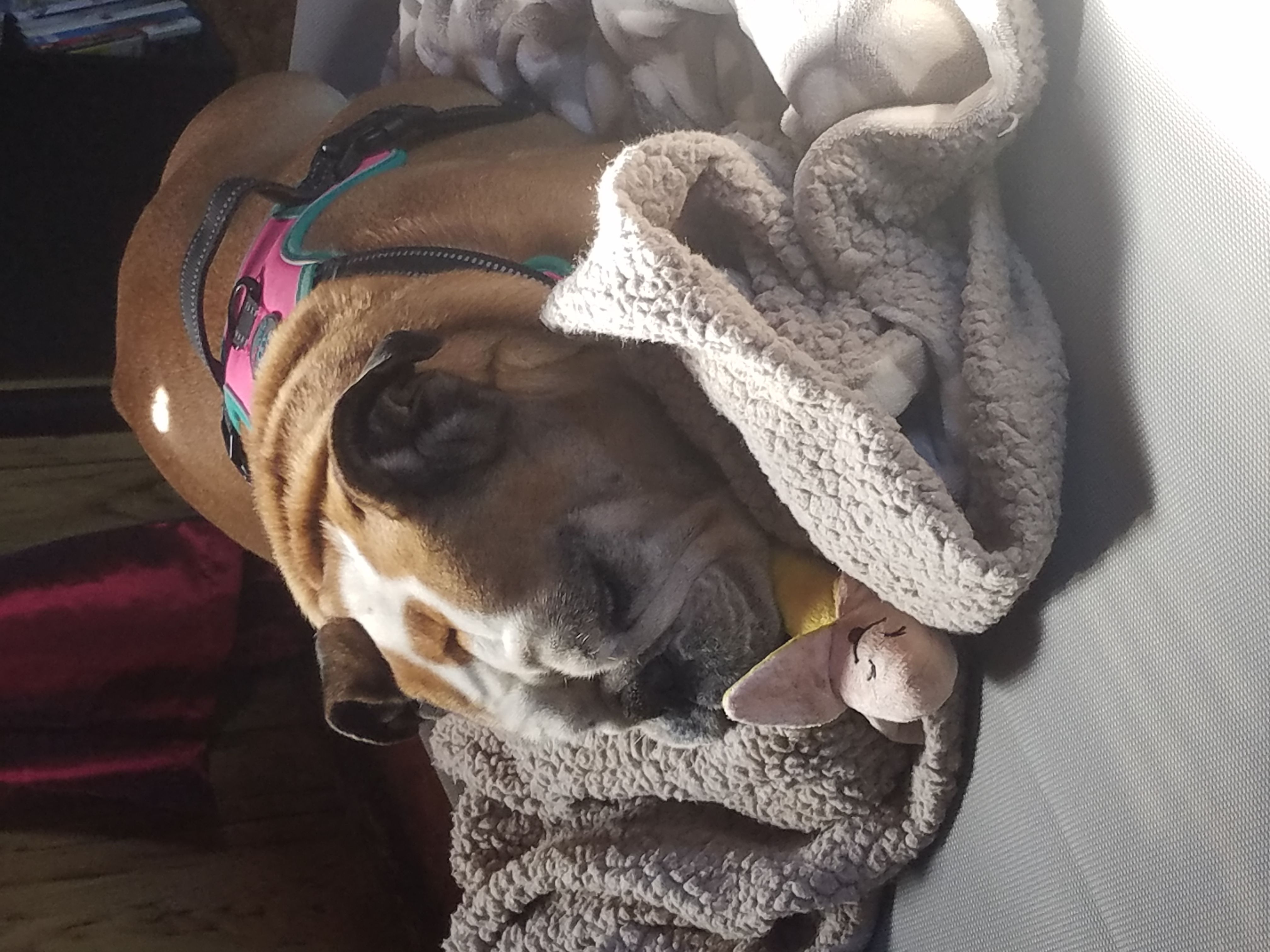 It must be a bully thing as both our bullies sleep with toys in their mouth. Our Dolly had a cuddly toy which was her favourite to fall asleep with in her mouth, a bit like a comforter