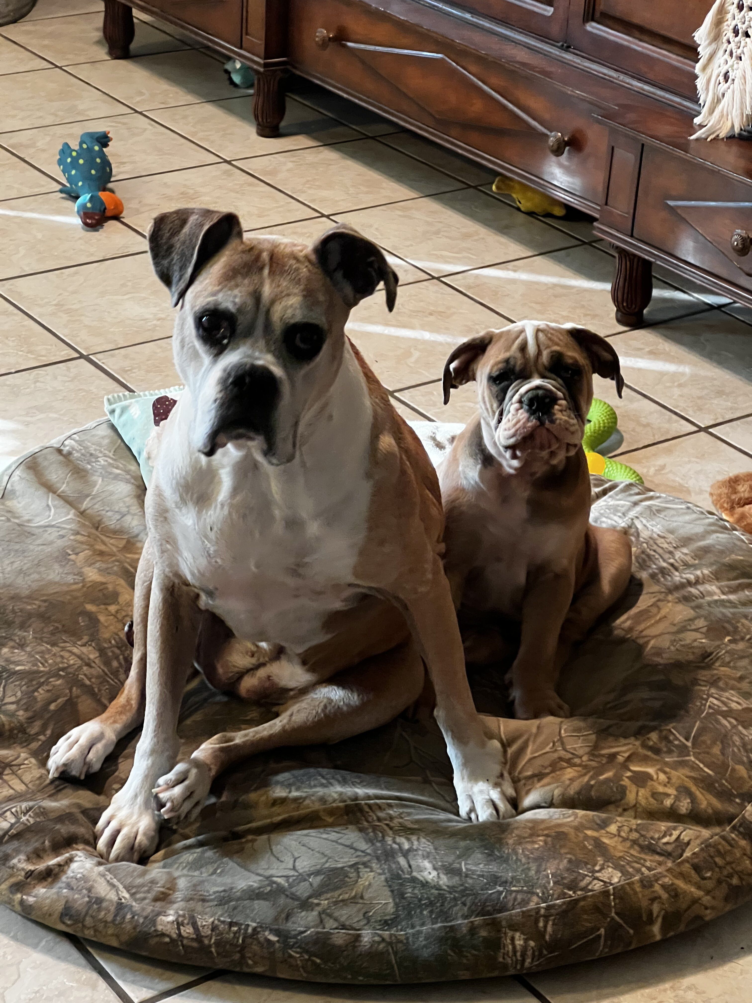 We do crate him when we arenāt home or need a little break. He will go to sleep in his crate with the door open often. If he isnāt laying on Sadie our Boxer. He is also very good with her. He doesnāt bother her as much as he does Bella! He seems to know she is pretty old (13 yes old) the third and 4th pictures are Frank and Sadie.