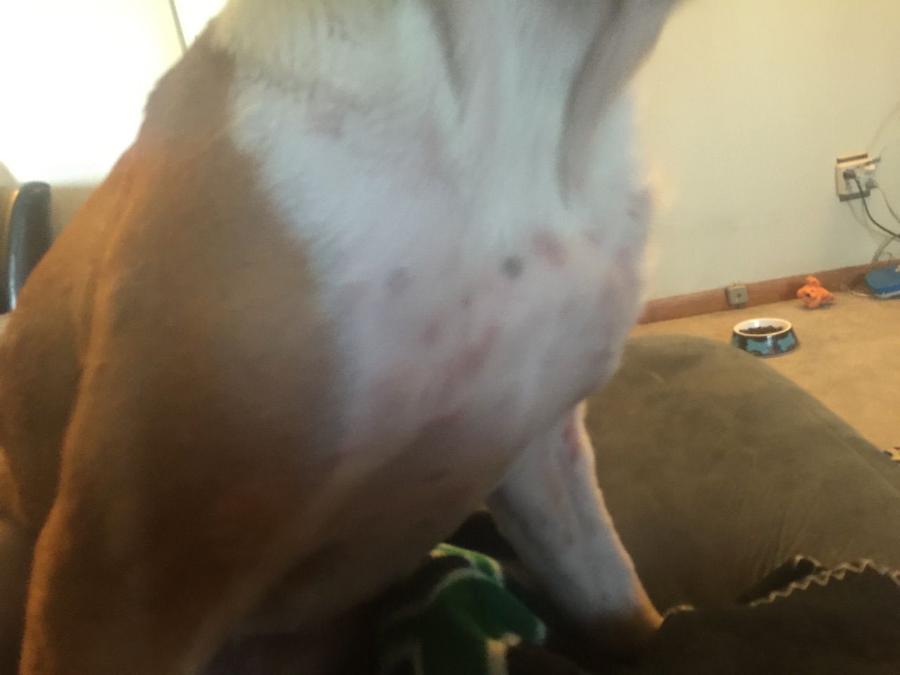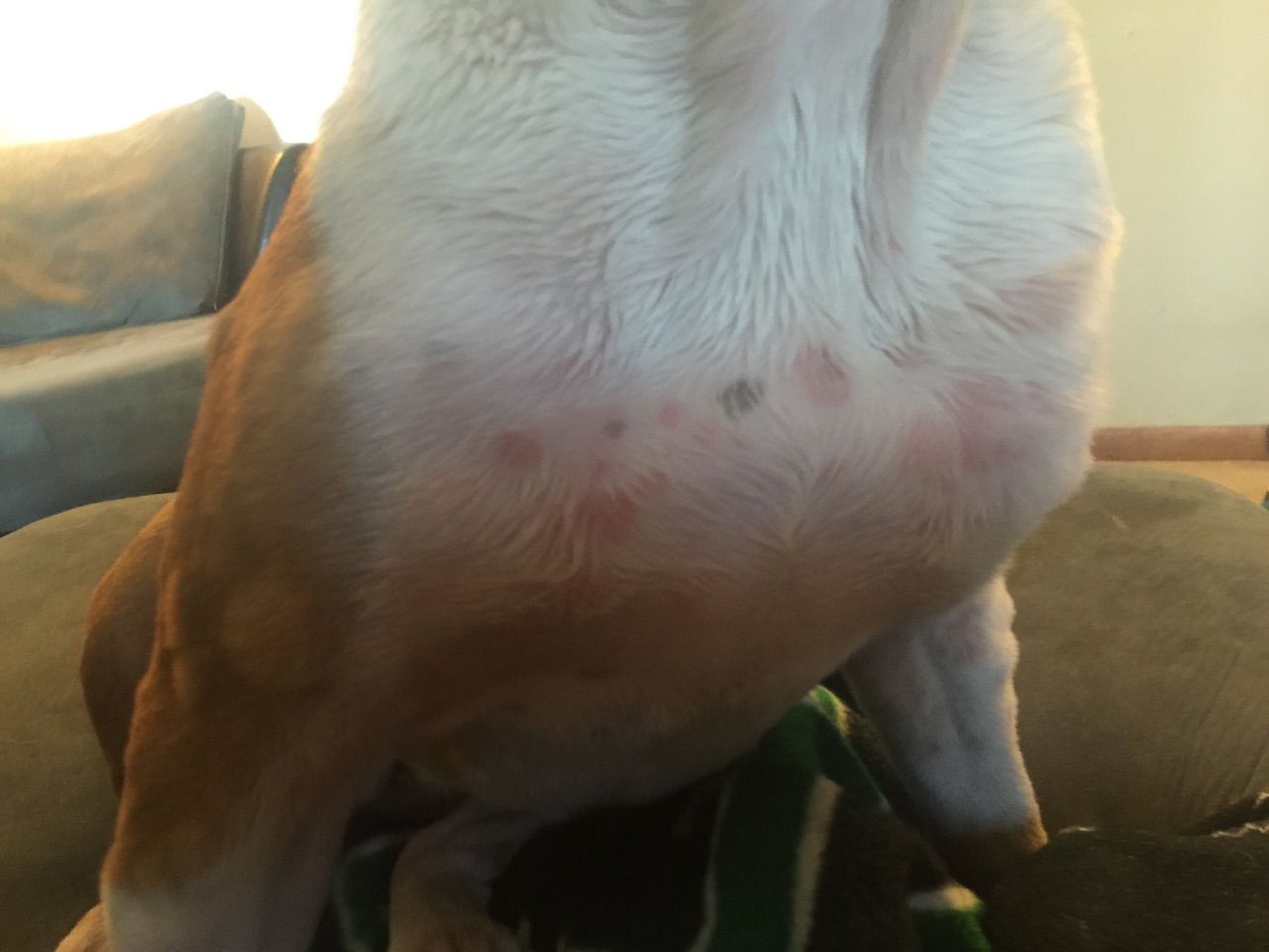So yesterday while petting Jovi I noticed there were two small and one large bump on her left leg. So I told my fiance about it and he said we will have to bring her to the vet in a few days if it does not clear to so if it's a tumor, I obviously hated to hear those words, but I agreed. We went to bed and woke up and all I see along the back, legs, chest are bumps. They are everywhere! And on her chest she has red spots. What is going on?!?! I must say that about 3 weeks ago I was switching over to Merrick so that was mixed in with Fromms to get her switched. But then I heard I should give her Zignature as it is limited ingredients and does not contain potatoes which she has a yeast issue so about 4 days she has had a mix of Fromms, Zignature and Merrick so I can switch her over. I have noticed though for about 3 weeks shes been really itchy and I just though they it was just her allergies but now she has bumps and she cant stop itching herself! She does not have fleas or ticks as I have checked her and our other dogs for them. I did just give her a bath with medicated shampoo and conditioner for itchy skin and gave her benedryl... But what else can I do? What is this? Also, I dont have a car currently and my fiance is at work so I don't have a way to the vet atm. I could though if it was serious but do you think it's just an allergic reaction? And what do you think it's from. We also did get new laundry detergent about a month ago and I just bought the stuff we usually use and washed our sheets to see if maybe that was the problem. Here are some pictures, she kept moving so this was the best I could get.