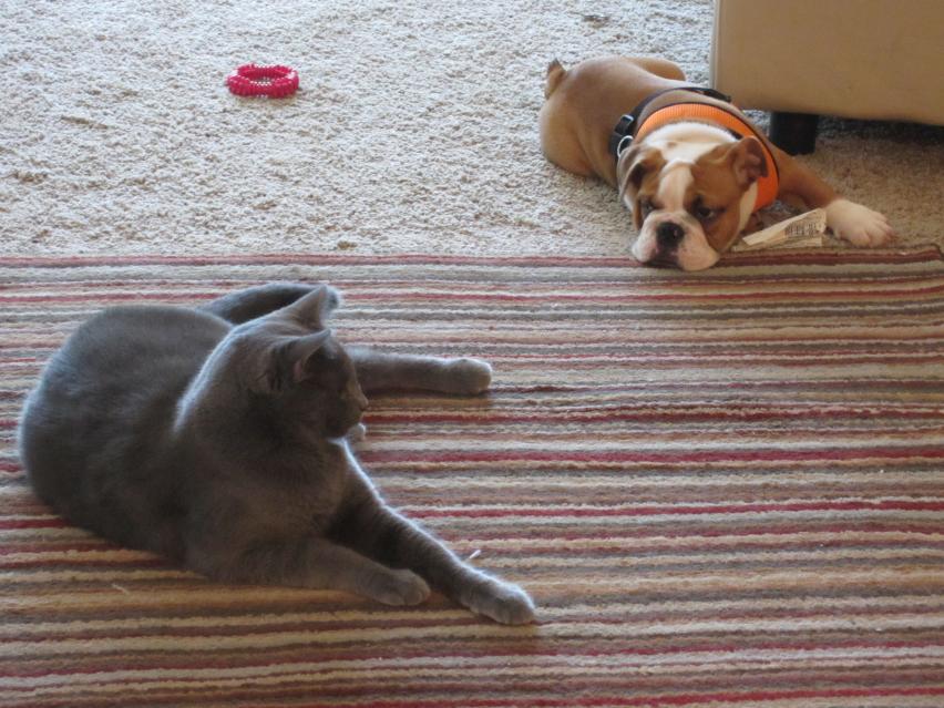 Hi! My name is Rocky Bullywrinkle. I am new here and just wanted to introduce myself (and my brother Merlin, a gray cat). Here's a picture of us relaxing in the living room. He won't let me sit on his rug, but I sit there anyway when he isn't looking.