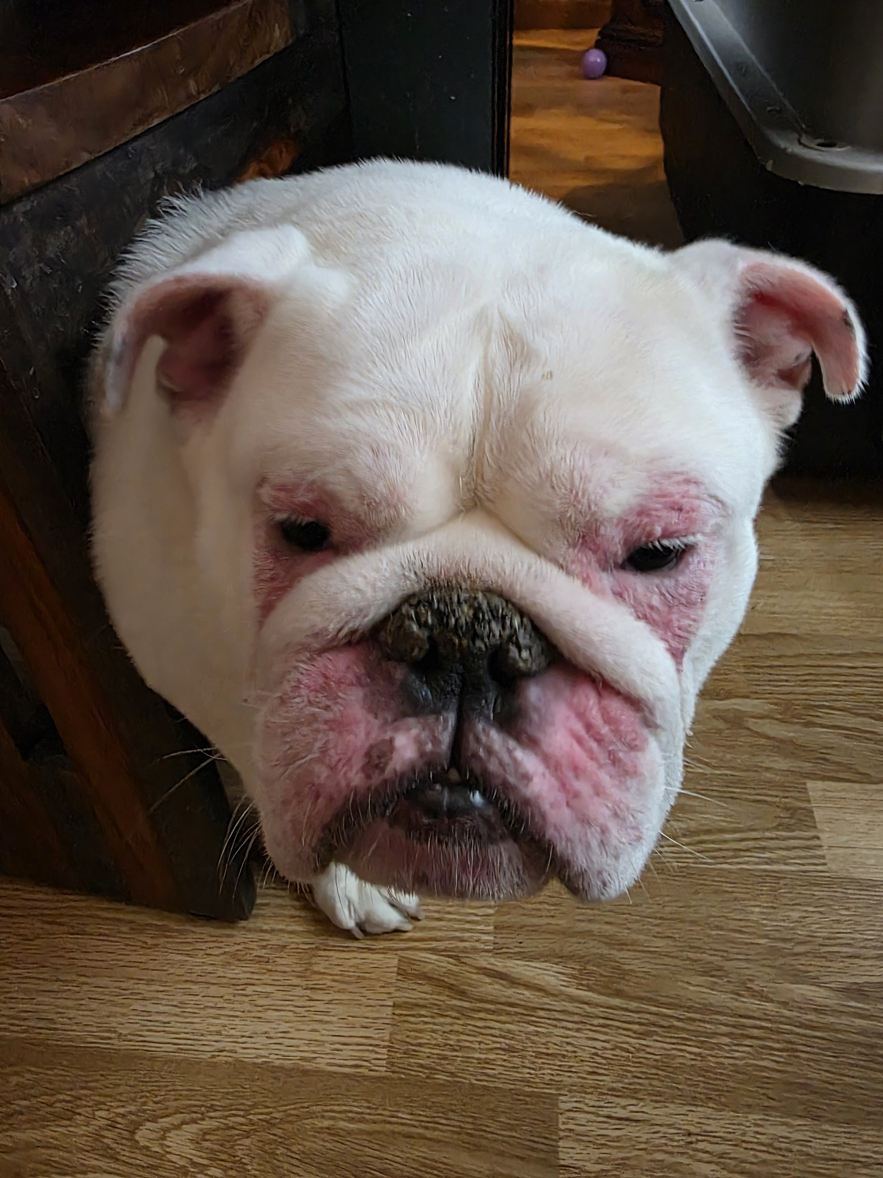 Our one English bulldog is constantly having issues with infections and allergies. I need all the recommendations to help her, we are currently looking for a new vet who understands bulldogs better. Her recent issues are redness around eyes which is new, and skin irritating with bald spots again. Her nose is so dry and cracked but its tough to treat it and not aggravate her wrinkles. Along with itchy ears. She's on prescription hydrolized protein food & apoquel but is still miserable. It seems we get one area treated then something else comes up. Please give me all the recommendations to help this poor miserable girl. She is constantly hiding and chomping the air while being itchy. We hate to see her miserable like that.