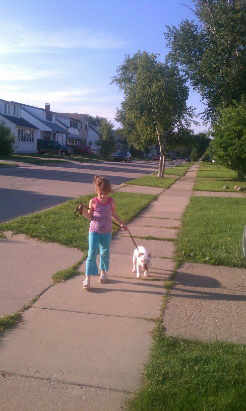 Even my 6 year old can walk him without being dragged and pushed around.I know that age and how he has grown up probably makes a difference. He was 3 months when I got him and grew up with his mom and littermate - inside a house with little kids.