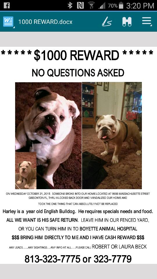 Pretty sure they found him. Fs on Craigslist, set up a sting with the police and caught the theifs and got their dog back!