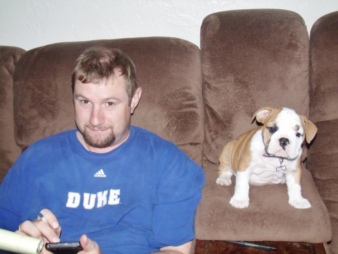 I had to add pictures of my youngest daughter with Lola and my hubby, wish I could get a picture of both girls with Lola but my oldest never holds her or acts to interested. Lola sits right next to my husband while he does his office work at home and its like im not even there she just follows him around! He is Mr I dont like dogs but he got himself a bulldog key and to go mug with bulldogs all over it, and we went shopping yesterday at petsmart and he didnt question anything I put in the cart! He also didnt complain of the total price at check out, I think he is ill or maybe just in love with his bully?