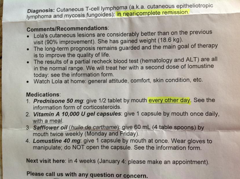 I just wanted to ad that Miss Lola never felt sick not even once she just as playful, hardheaded and farting as always hahahahhaha it was only a skin issue but now thanks to Lomustine is all cleared out ;D
