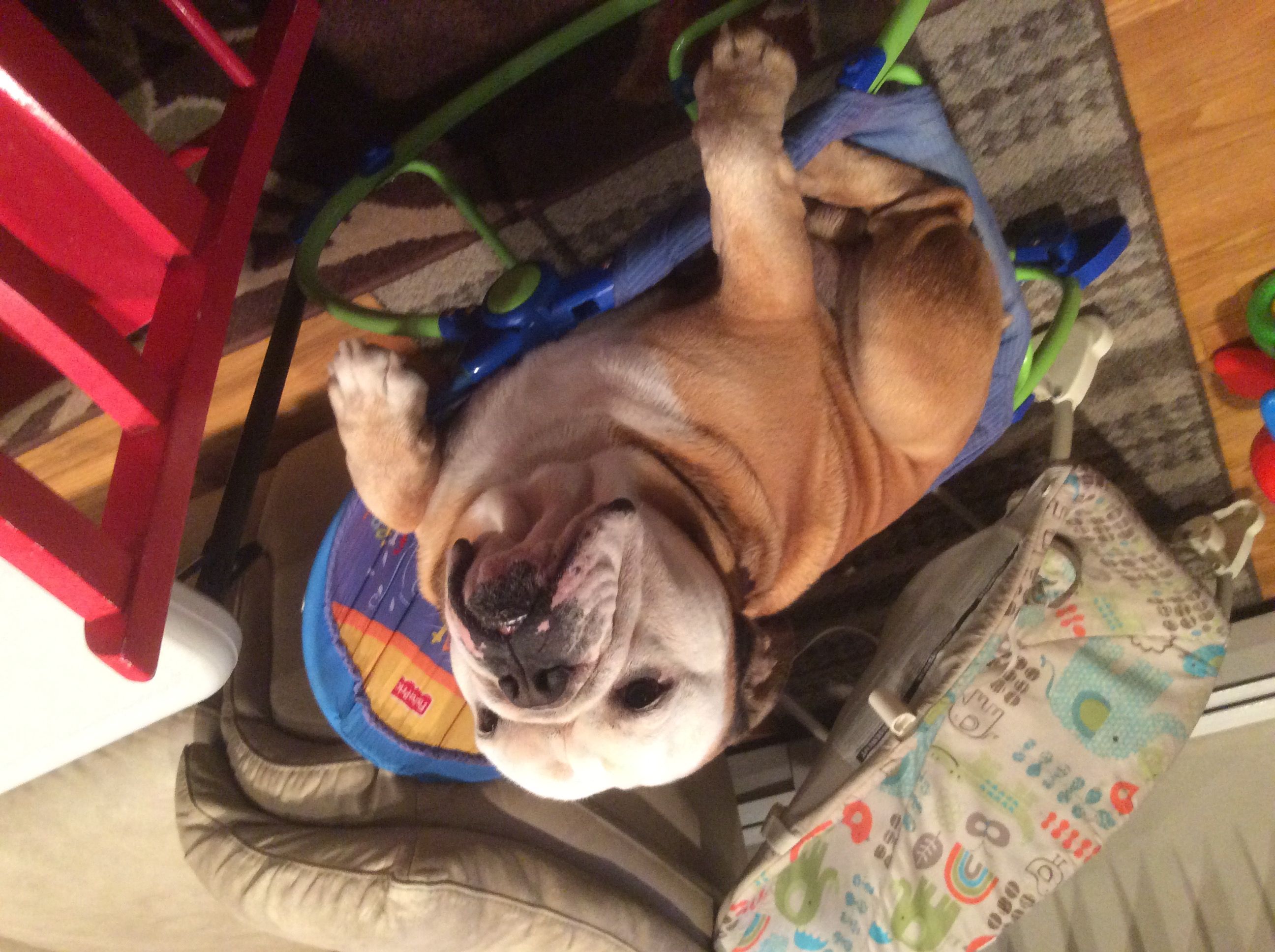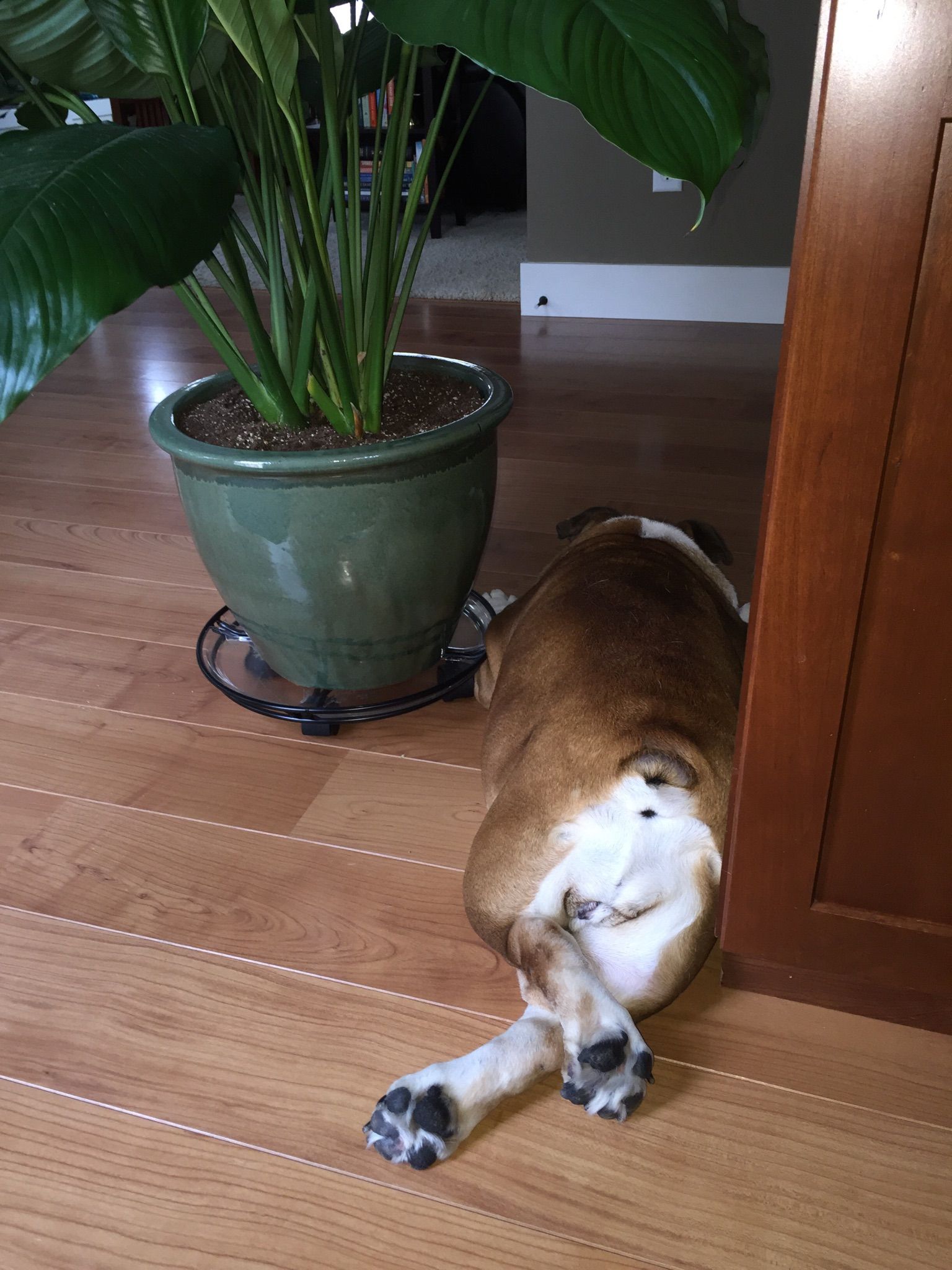Does your bulldog like an out-of-the-way spot like Mabel? She has discovered this large potted plant and loves "hiding" there.