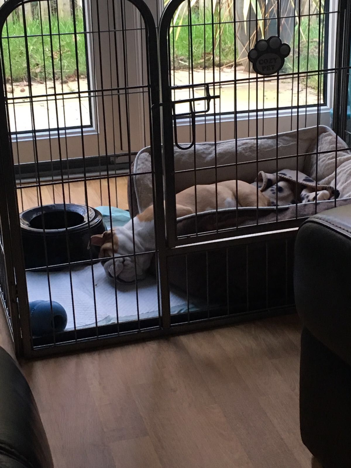 Something to keep in mind with a puppy and potty training... they can only hold their bladder for one hour more than they are old.. so 3 hours is the push of his limit... he has to go out or you are cleaning the crate a lot. Also, bulldogs are human dogs (aka velco dogs) this they know you are home they want to be with you... it is who they are so working at home he knows you are there, it is very hard for him not to be in the same room as you -- it is part of the make up of a bulldog breed is to be with their human. Just keep that in mind while doing your training