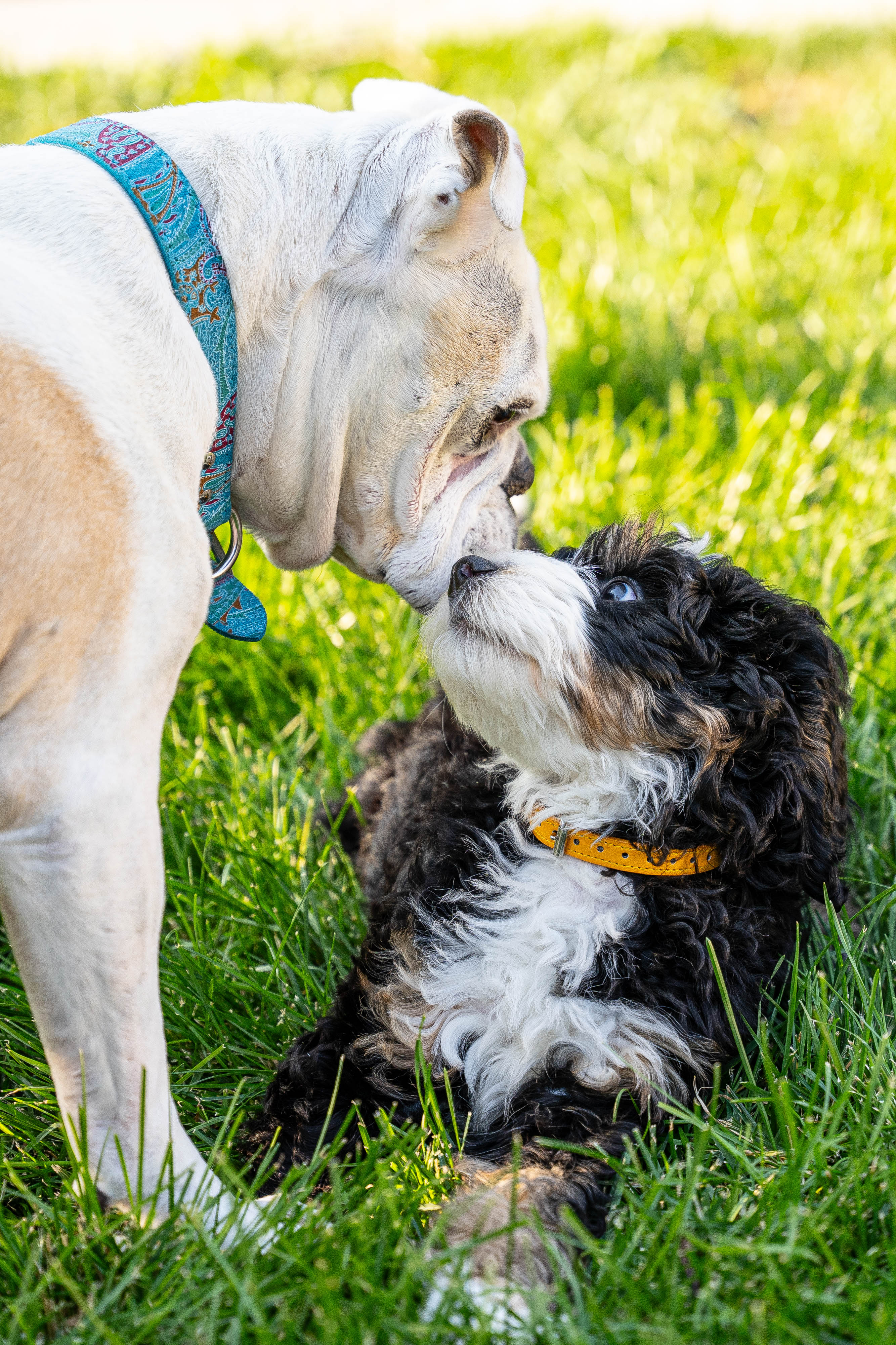 She's slowly warming up to the new puppy... we even almost had a 'snuggle' between the two (but then Molly kicked her legs and pushed the puppy off the pillow).