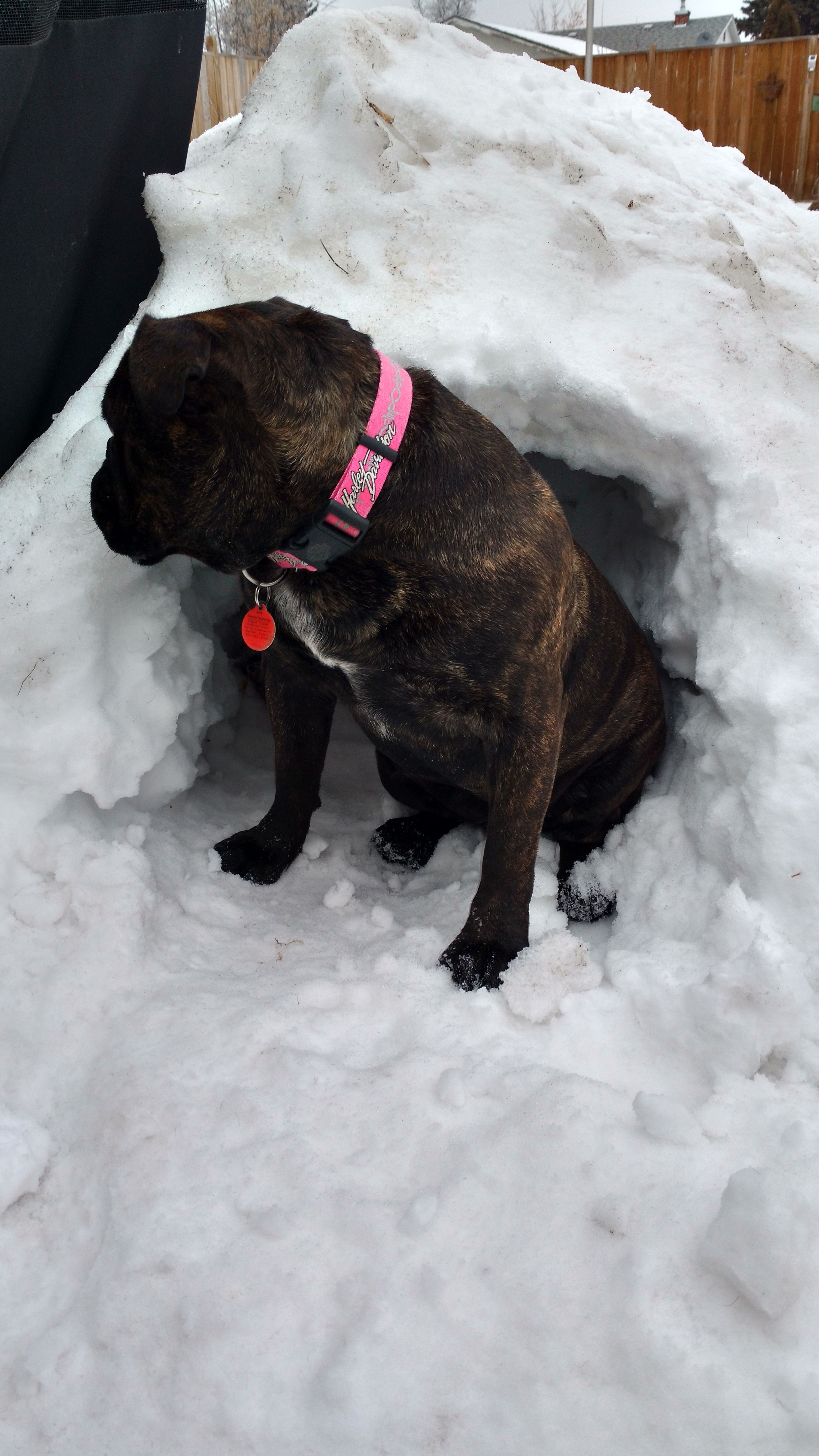 Funny... I was gone all day which I do 2x a week from about 8am to 5pm.... I come home, she's running everywhere cause she's so happy to see me. Jumps on n off the sofa, runs across the house. Im trying to reach the back door so she can go pee. I open the back door and she torpedoes all over the yard like losing it. She runs for a quick pee runs back towards the house and decide to run into her igloo and I dont know what she was thinking, rams in the back wall of the hole, whacks her her like a bull, comes out with a big chuck of ice sitting on her head! I just cracked up laughing. Of course i didn't have my phone on me for a photo. What a clown this little Nyala.