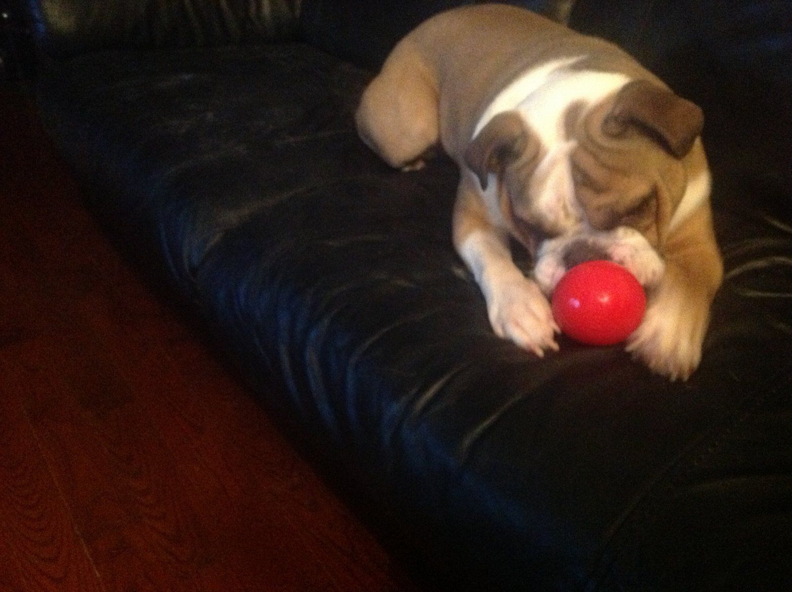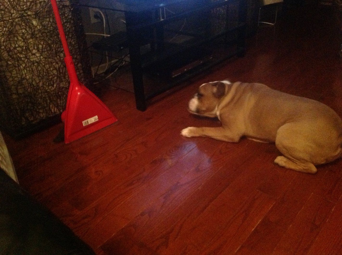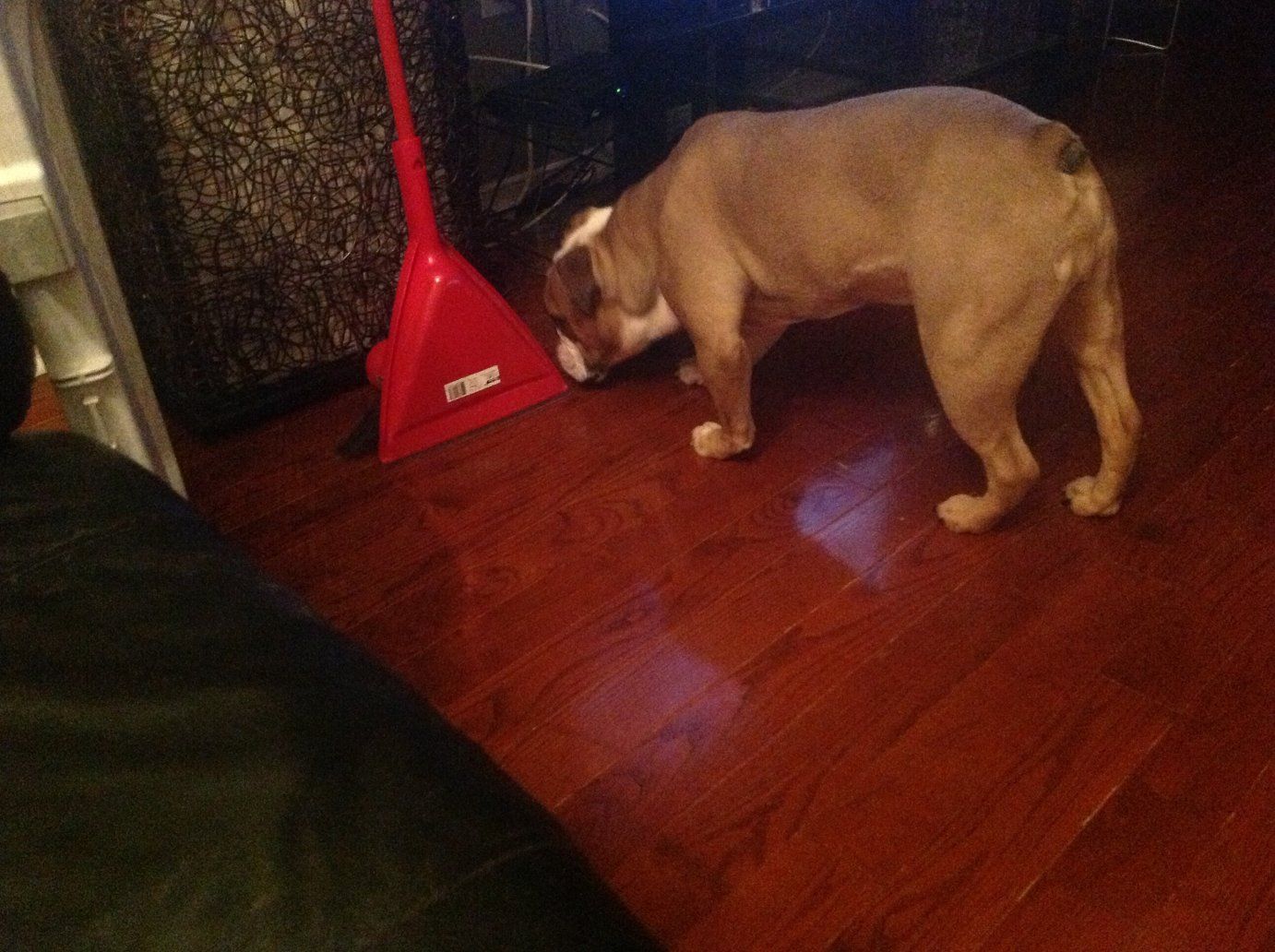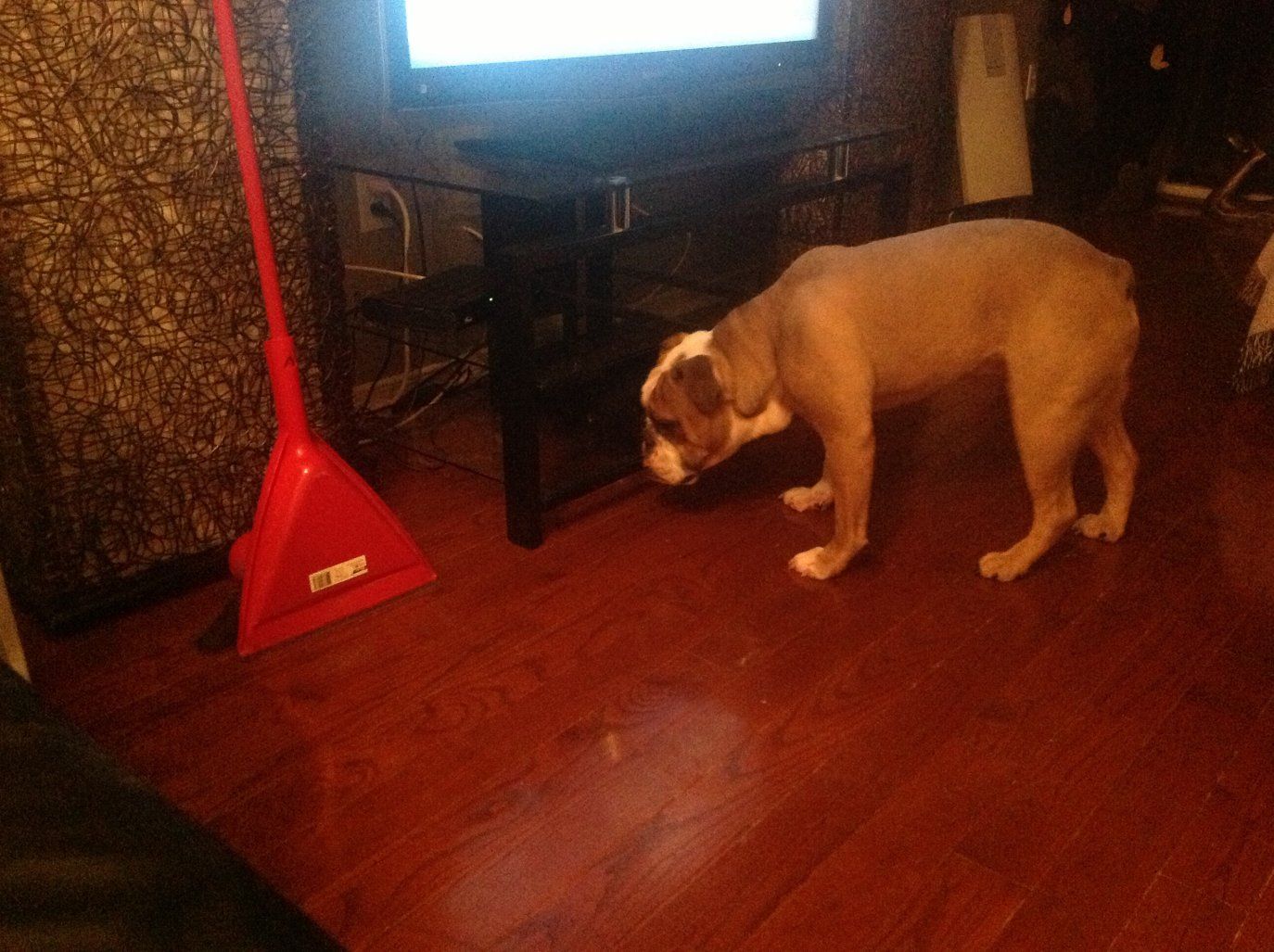 Dozer's ball rolled behind the broom and dustpan, and he was terrified to go near it, lol. He growled at it at first and then gave up and laid on the floor sulking. He looked so pathetic. Silly boy. Mommy got it back for him.