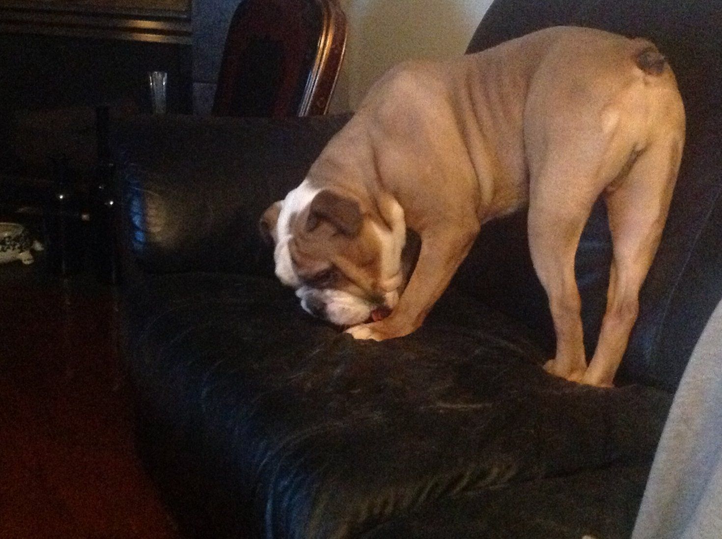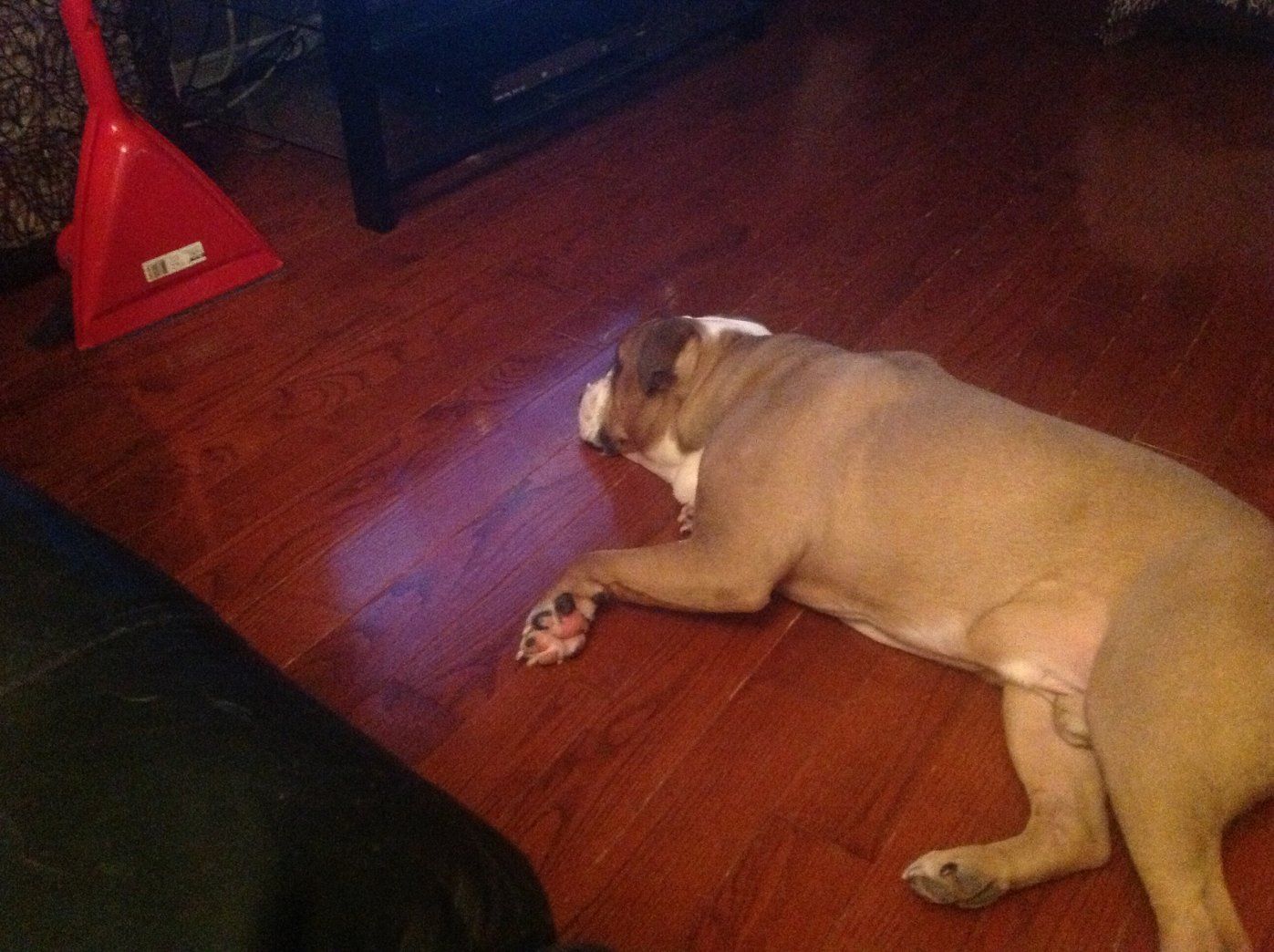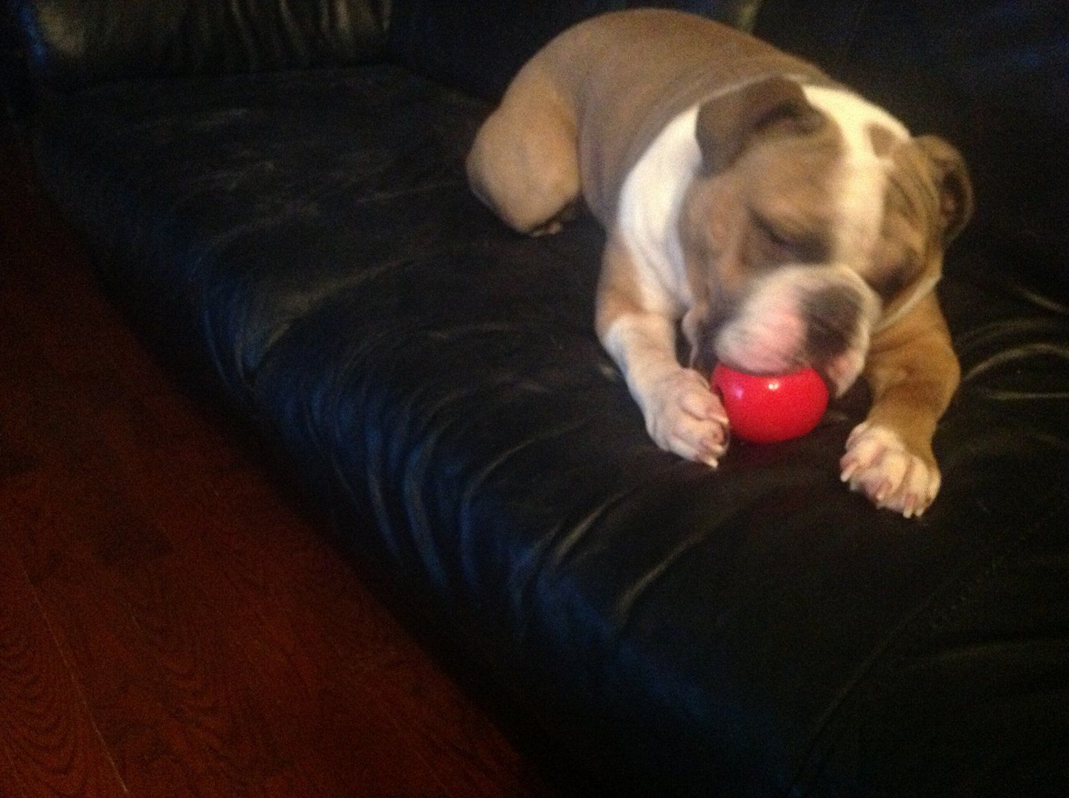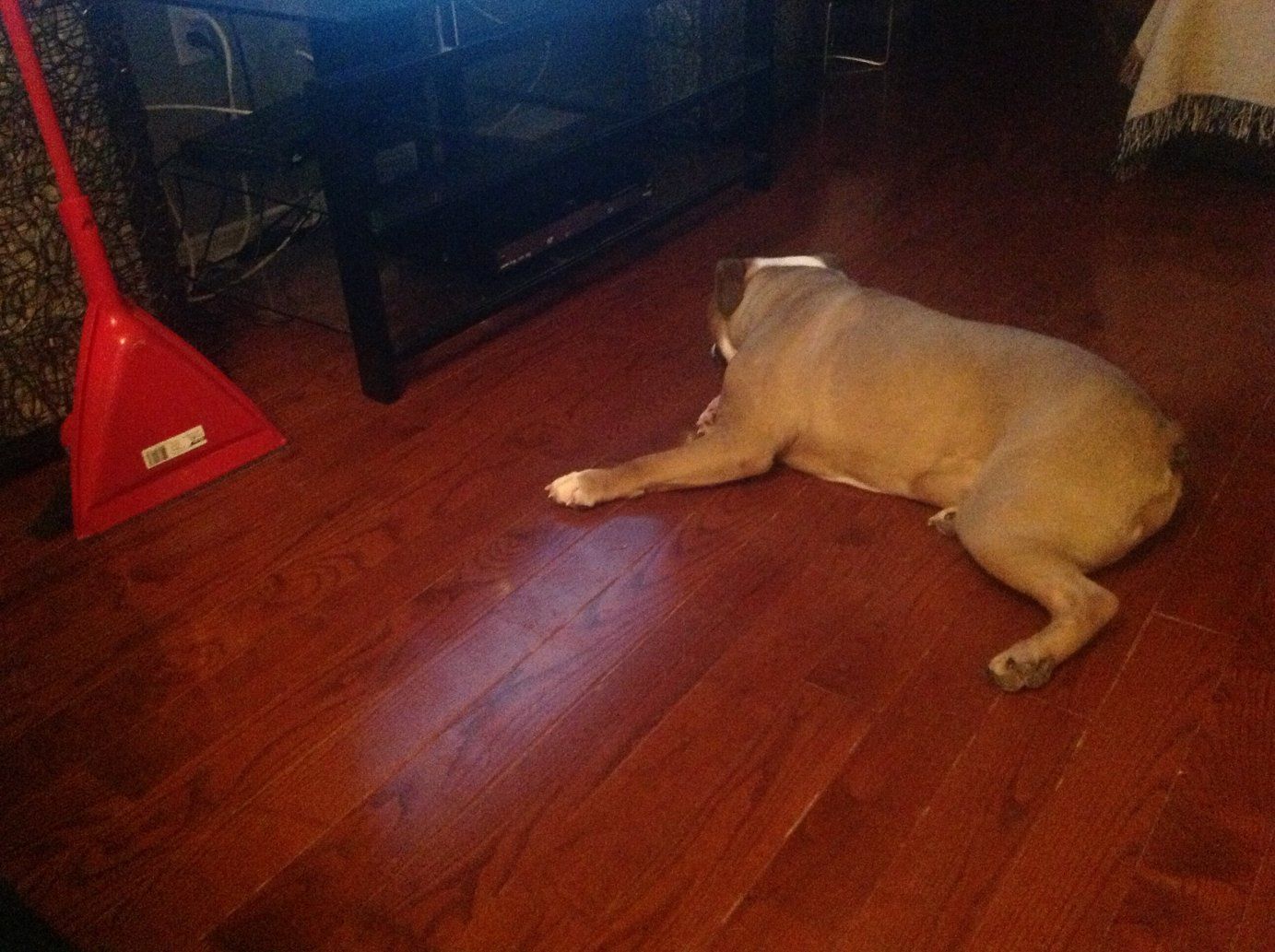 Dozer's ball rolled behind the broom and dustpan, and he was terrified to go near it, lol. He growled at it at first and then gave up and laid on the floor sulking. He looked so pathetic. Silly boy. Mommy got it back for him.