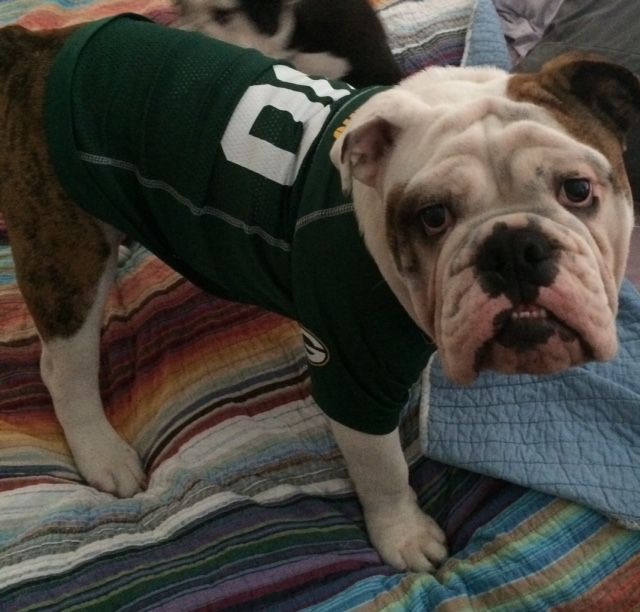 guess Tucker and I have somethings in common, Manydogs anything you would like to add since You did bring it up LolI just had to share this picture of Tucker in his brand new Green Bay Packers jersey! We tried it on this morning for the first time, and he looked so handsome. He is not much for posing though!