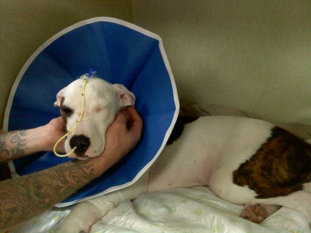 . Plus, the dogs often bump into things, which in your case could irritate his neck even more. "ProCollar" is one name of an inflatable collar if someone hasn't mentioned that yet. Might work for neck wounds and be more comfortable for a bully, but my Shepherd was able to reach an incision on her belly.