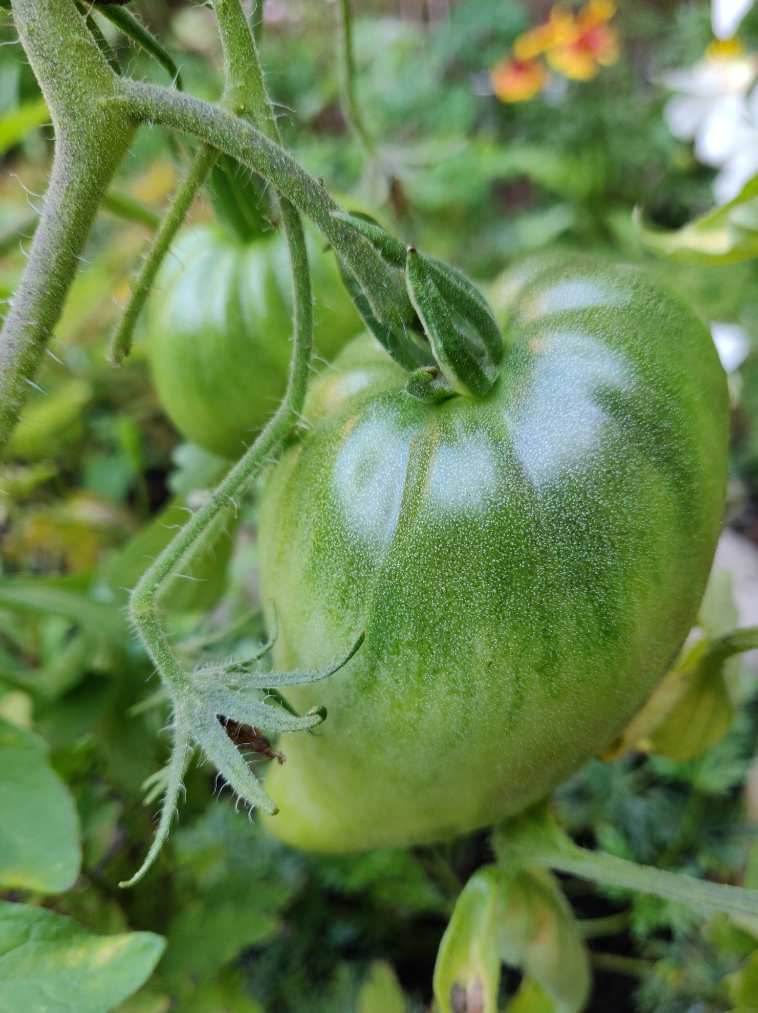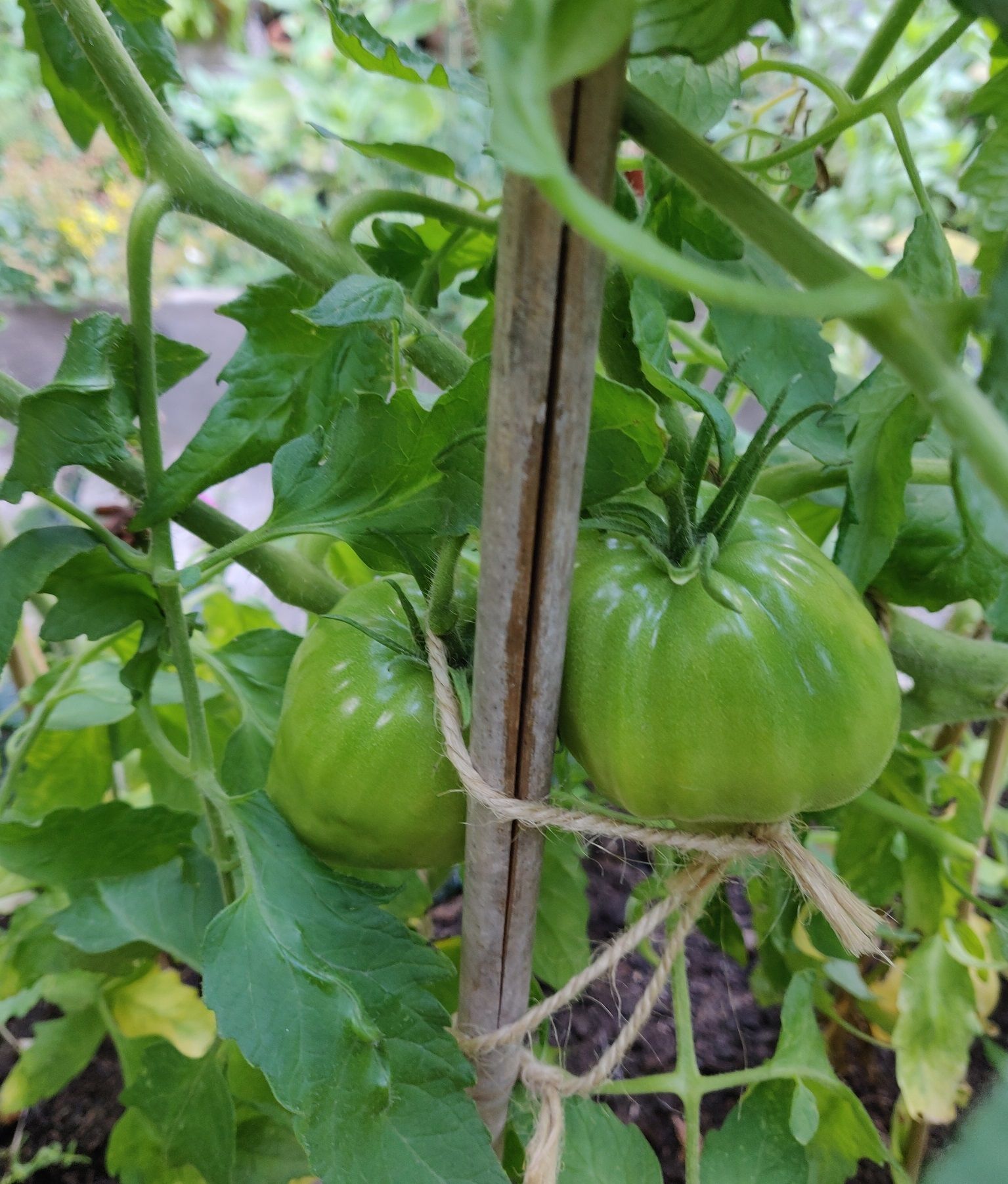 Look! Finally starting to look like tomatoes, and they are really big! I was a little worried that there were so few of them, but one of these will make a good-sized tomato sallad!
