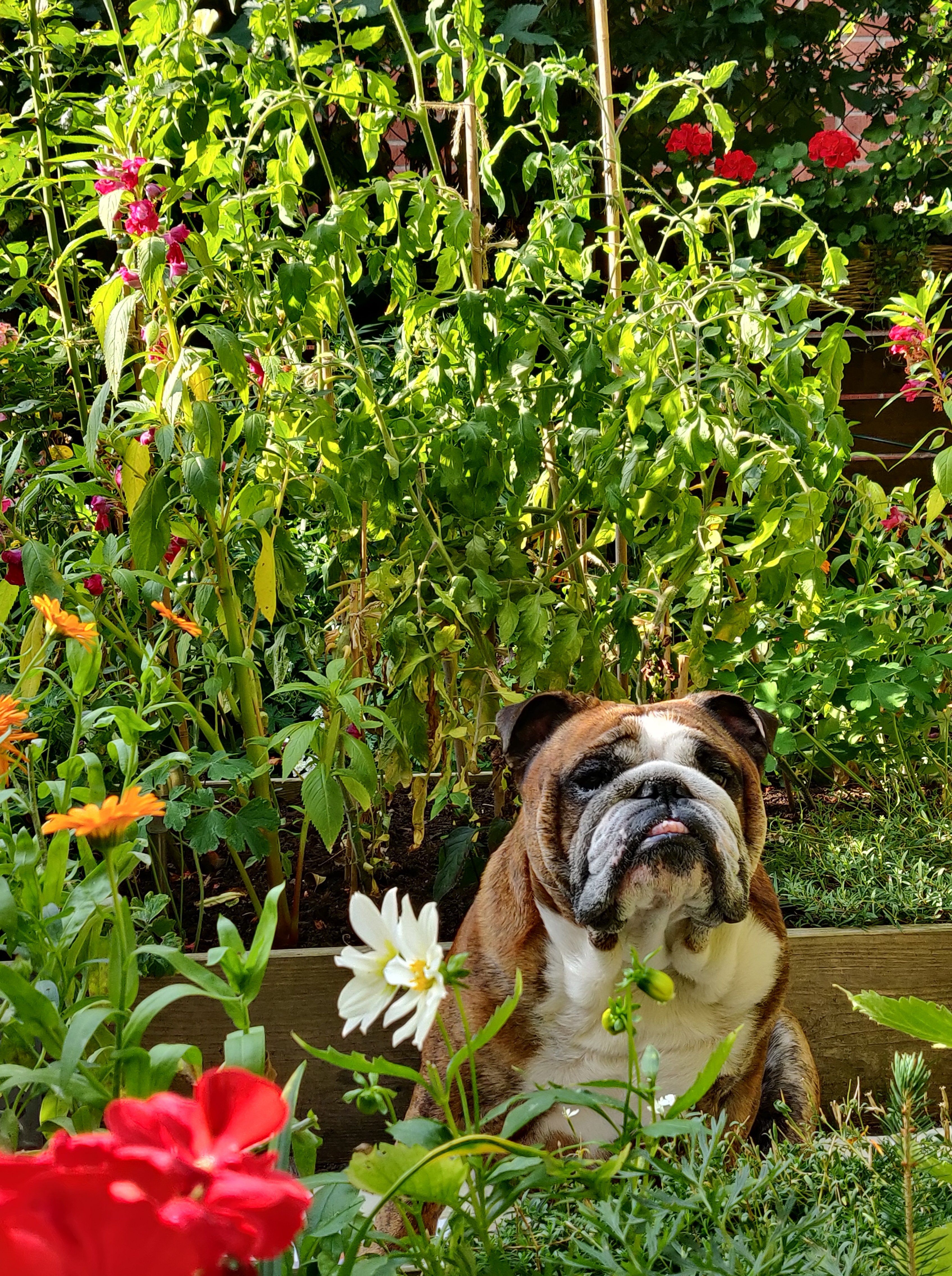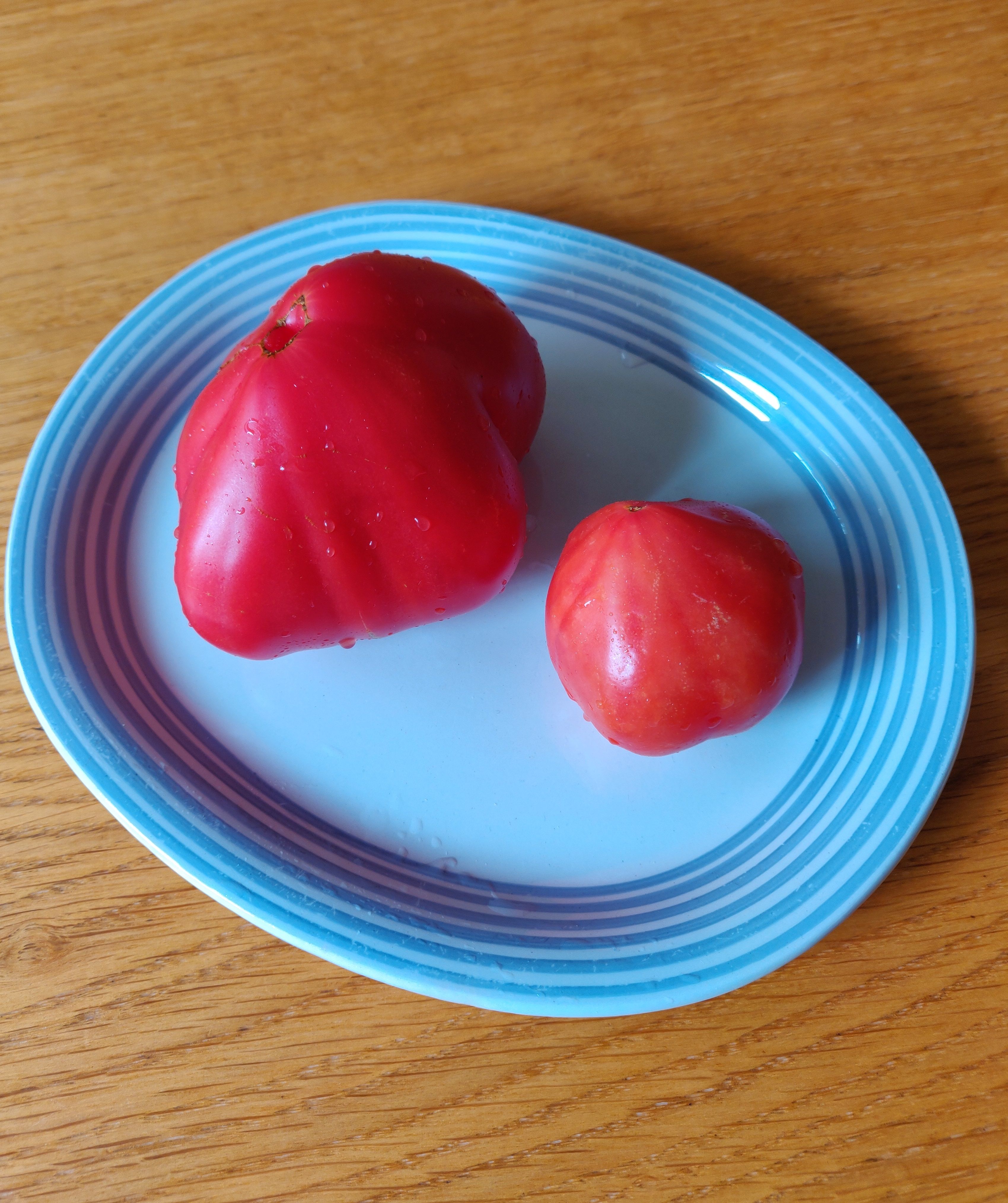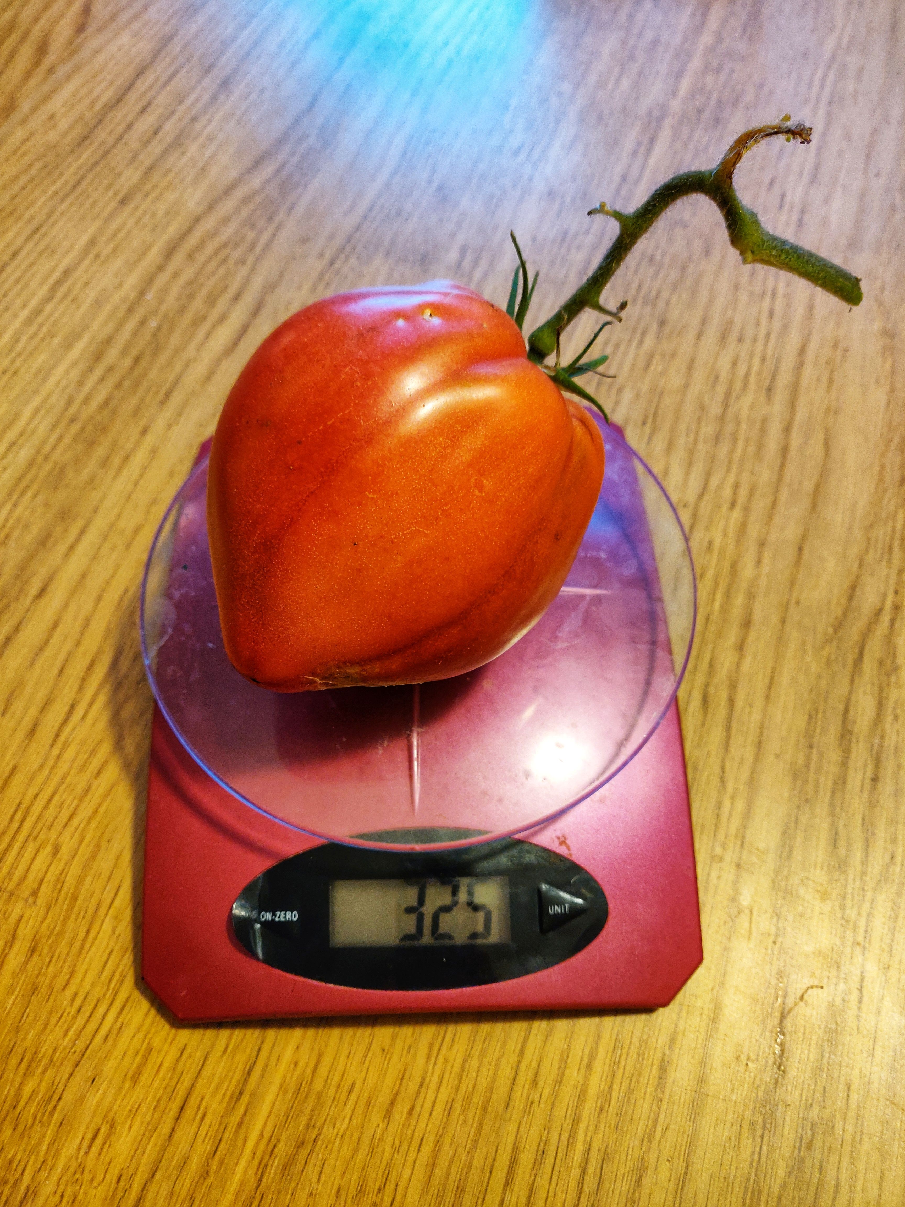 @helsonwheels Look - they're getting bigger and bigger. This one is 325 g! It's not from the 150-year-old seed but from one of the other seeds and the shape is a little different. As you can see, Castor is very proud of our tomatoes (the tomato plants are right behind him)