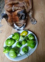 No, no, Castor is only admiring, not fertilizing, the tomatoes! My dad's tomatoes are not that big, more big plum size. His plant has more tomatoes but less size, and my plants seem to have fewer tomatoes but bigger (although I think the remaining ones will not be bigger than the ones I've shown here). Next year, I'll ask my brother to grow these too (I'm saving seeds...) so let's see how big they get then!
