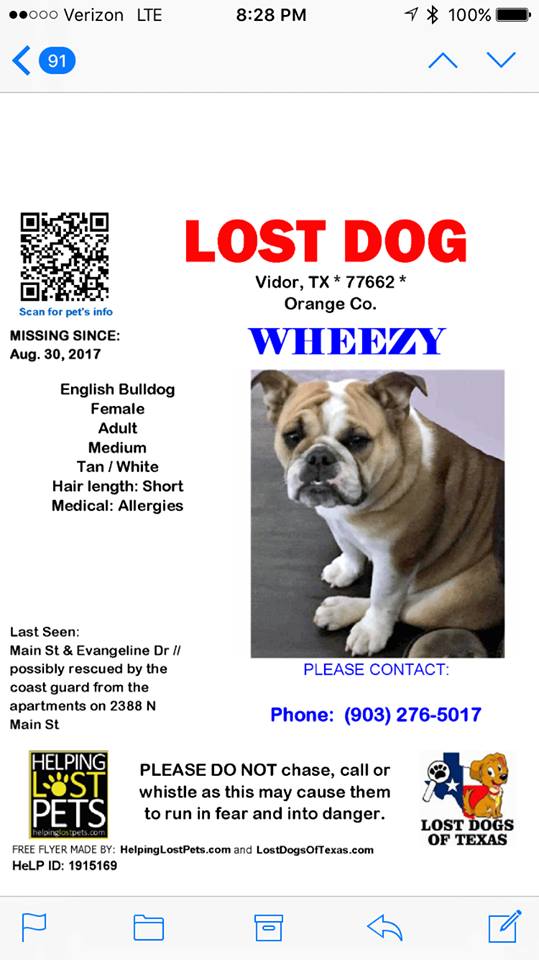 Wheezy and my husband were stuck in the flood waters in Vidor Texas for 3days. For those 3 days my husband carried wheezy and swam with her over his head. On the 3rd day they had found a safe place in a second story apartment on Main Street in Vidor. There were about 13 people and 3 dogs in this apartment. The apartment was crowded with not enough food for everyone. The older lady that lived in the apartment was the mother of one of our friends. The 3rd day my husband and 10 others decided to evacuate by boat, they were going to take the dogs but the older lady said to leave them with her and she would take care of them because she would not be evacuating. The animals had plenty of food and the people were exhausted so it sounded like a good plan at the time. Unfortunately the older lady decided to evacuate about 12 hours later. She said that when she was rescued by boat the person who rescued her put people in one boat and animals in another boat, when she made it back to land the animals were gone. She said she does not remember what the bot looks like and that she did not see the animals again after reaching land. She was told they would be taken to evaDale. Upon receiving this information we checked evaDale and they said they had rerouted the animals to the Buna ag building. I have talked to several teachers and volunteers at the ag building and they all same the same thing, "an English bulldog never came through there". My friend visited the ag building and met a young man who admitted to seeing the dogs and he was able to describe the dogs perfectly from the collars they were wearing to the crates they were in. He said he took the 3 dogs off the bus, tagged them, and placed them back on the bus to go to nacogdoches,tx. I personally drove to nacogdoches and wheezy was not there, nor were the others. They also said they had never seen an English bulldog. I personally visited shelters in Texarkana, Shreveport, Alexandria, Lafayette LA, Tyler, nacogdoches, center, Jasper, Lufkin, orange, port Arthur, Beaumont, Vidor, bridge city, Buna, kirbyville, Montgomery county, brazoria county, Austin, NRG arena, and a few other smaller ones outside of Houston. We went to Ford park and Houston spca but they would not let us come in and look at the animals and keep redirecting me to the website which clearly does not have all the rescued animals listed. Wheezy is a female, fawn colored English bulldog. She is 2 years old and medium sized, probably between 45 and 50lbs. She is loving and playful and has more energy than most bulldogs. We miss her so much. The other 2 dogs that went missing with wheezy was Jada a female blue pit wearing a purple collar and Max a little fluffy white dog(I don't know much about max). Please help us find our pup!!