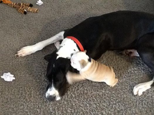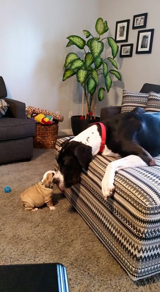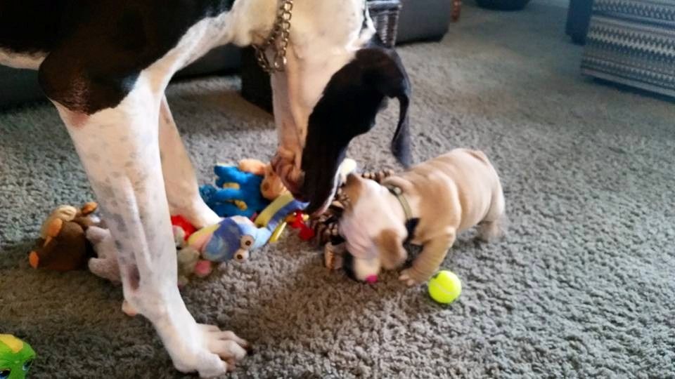 I don't know anything about Great Danes, but you will fall in love with your Bulldog like no other! Sorry if I'm partial.
