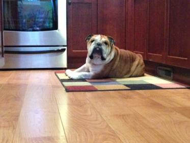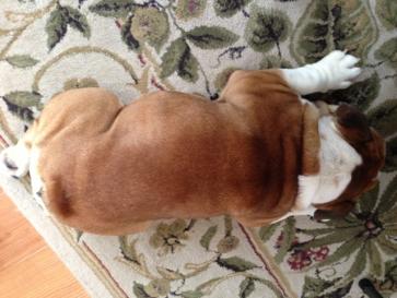 She appears to be housebroken and only had one accident last evening. She knows "sit" and sometimes knows her name (our bullmastiffs were the same--a bully trait perhaps?). She loves following us around the house, getting her butt scratched, and has found quite a few good napping zones! I found a bulldog vet in Grand Rapids if our regular local vet thinks she needs a specialist. We are feeding her Life's Abundance, which is what we fed our bullmastiffs. She is such a cute little chunk! I love the "white noise" snoring as she sleeps right by my chair!