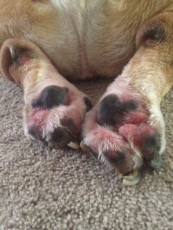 He has yeast infections in his paws, wrinkles and up his legs, he has double ear infections, his claws were grown into his paw pads and he has flank alopecia. they had him eating something akin to alpo or ole roy which makes me cringe just thinking about.
