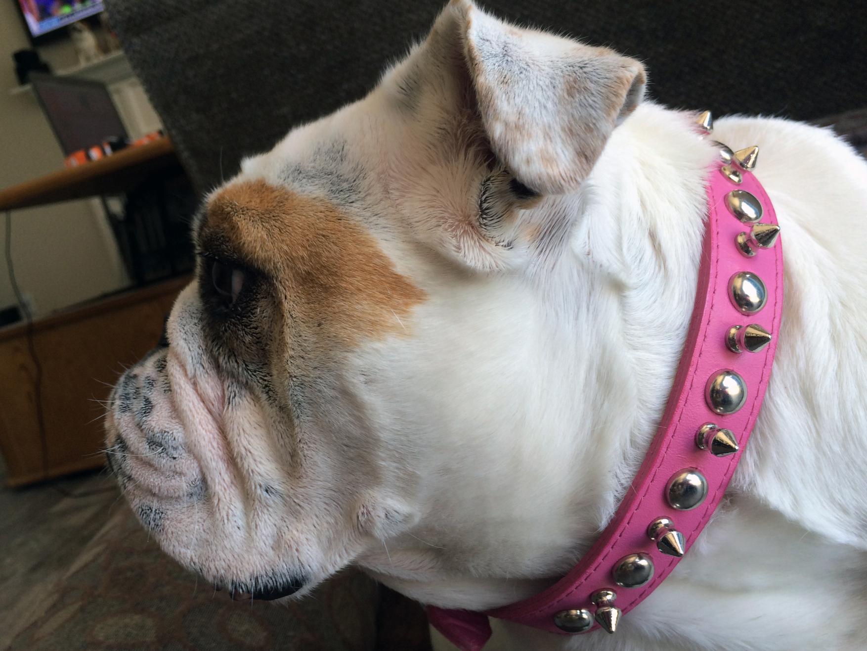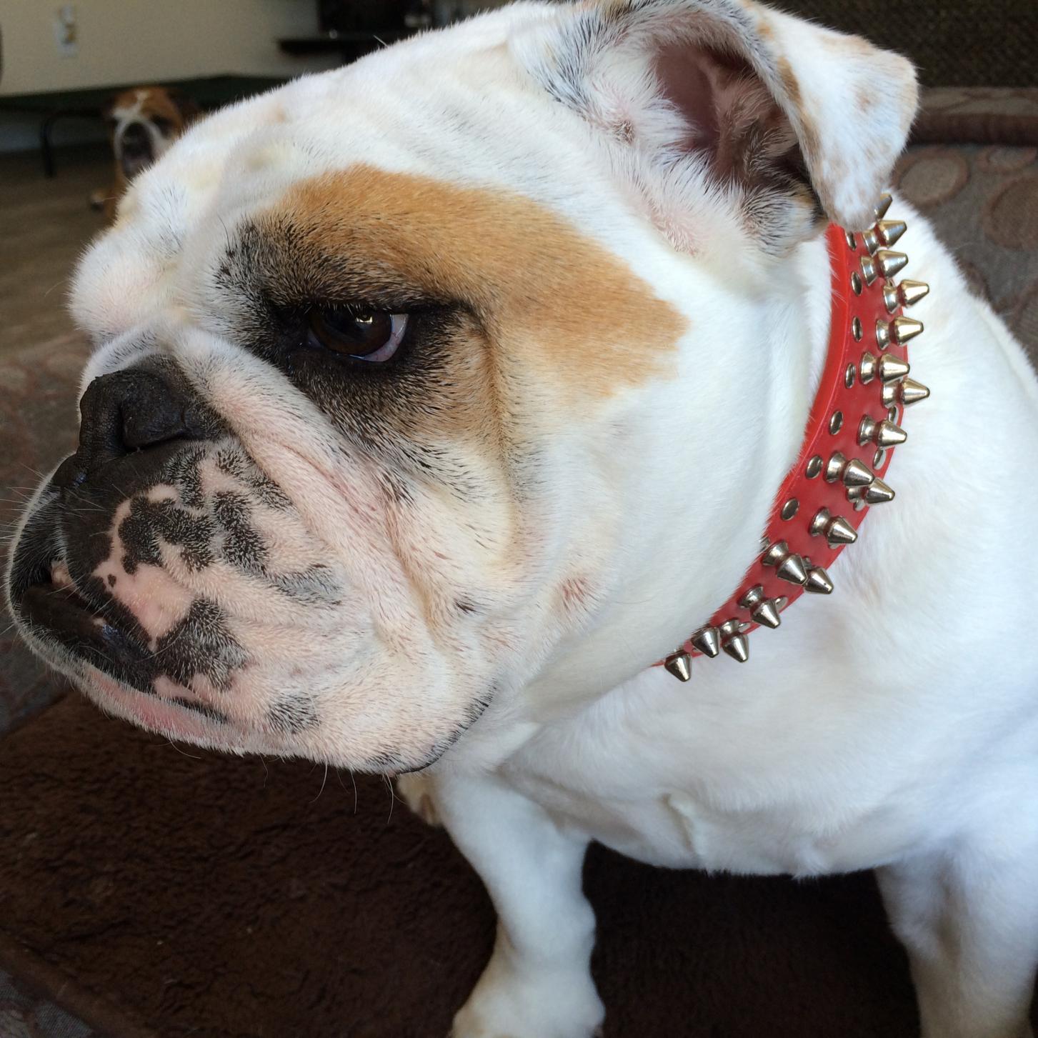 Looking good! We have some of them too! I bought Vegas a Harley Davidson collar when he was a little guy. He got it off and decided to chew it up...so I bought another. The little one is a single studded spike and the grown up one is a double layer. Unfortunately he never got the thick bulldog neck and it's too big for him. Two years ago I bought them each another at the Washington state fair. This one fits him and since they didn't have pink....I got Orion the red. Then, deciding O was too petite for the huge one, I got her a smaller pink. So....we have 6 all together. *sigh* Yes, I'm addicted to leashes, harnesses and collars.