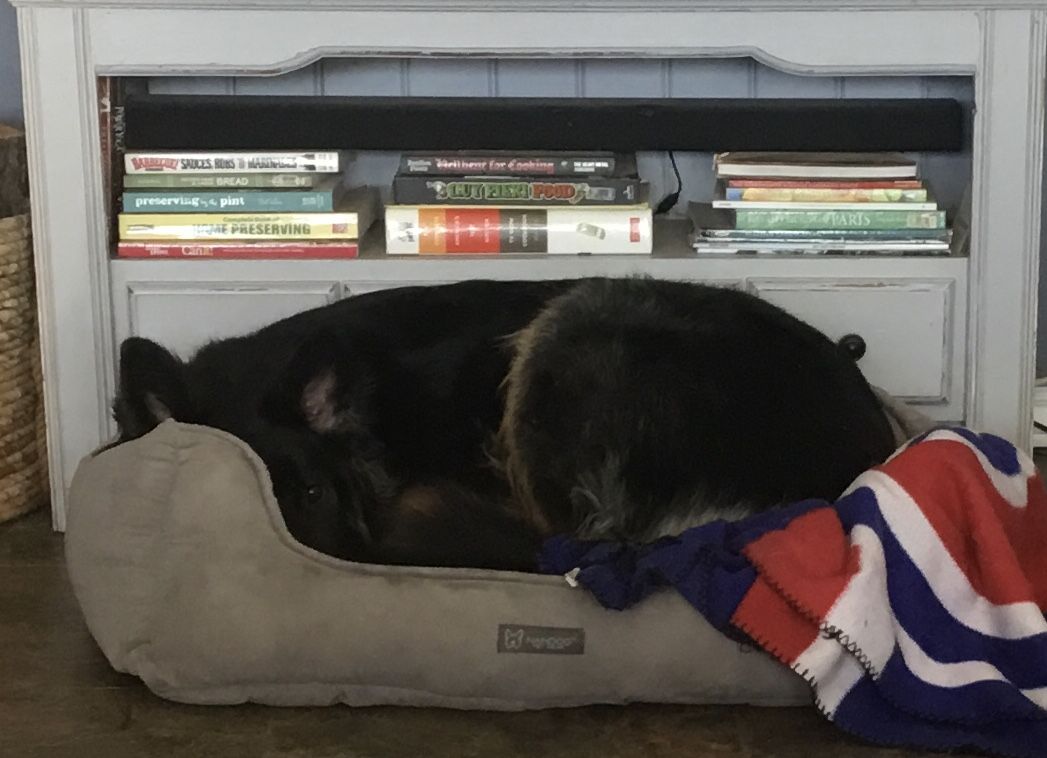 Lately Jake has taken over the big bed. She’s like some women trying them tight jeans thinking they’ll fit in….lolllLol, she clearly is trying to hide!