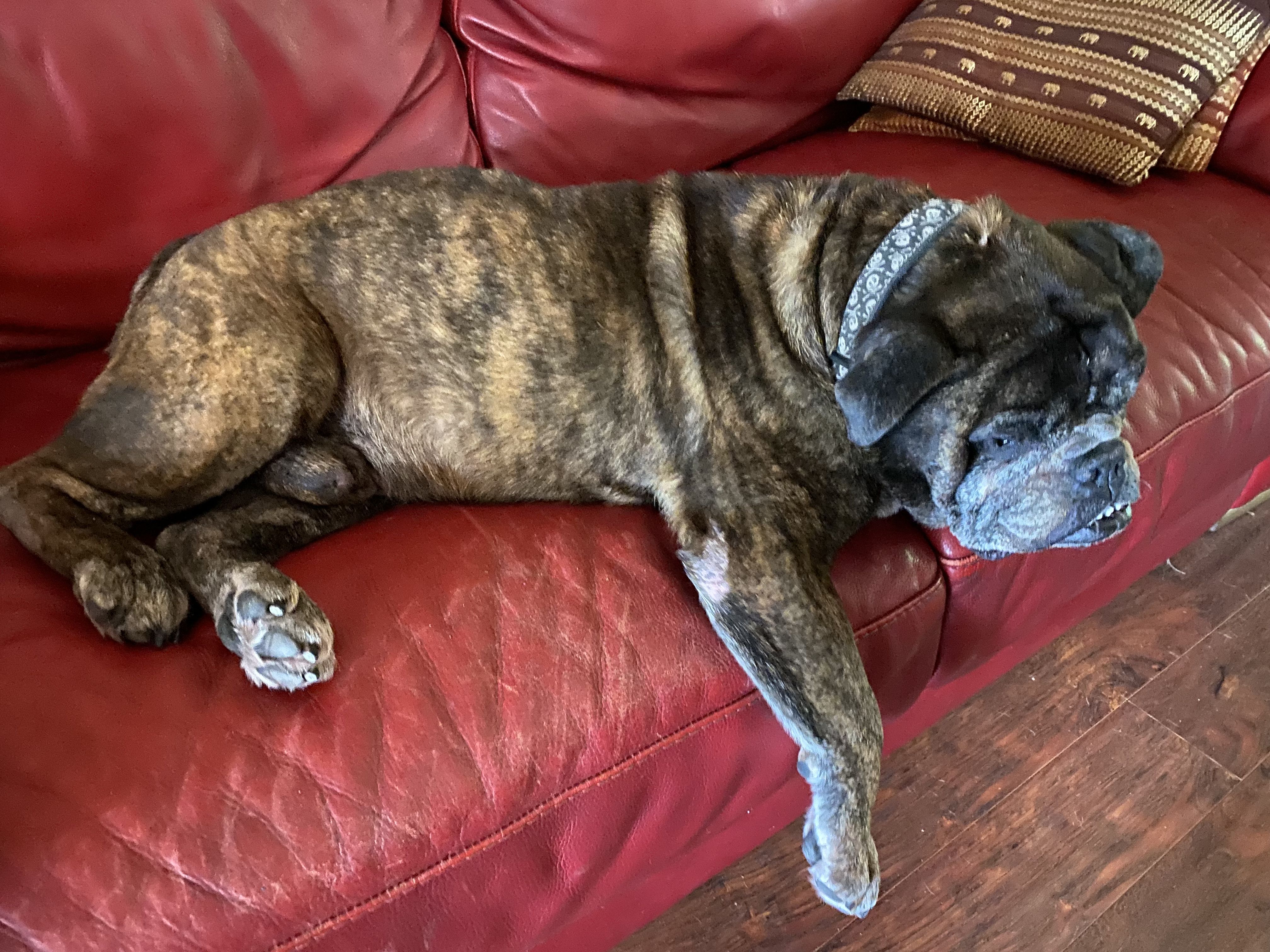 He looks great! Handsome fella right thereI feel your pain.. Kevin has no problems getting ON, knowing full well he has a hard time getting off the couch. I end up having to build him some type of ramp... with a plate of frozen broccoli* as a 'reward' (bribe).