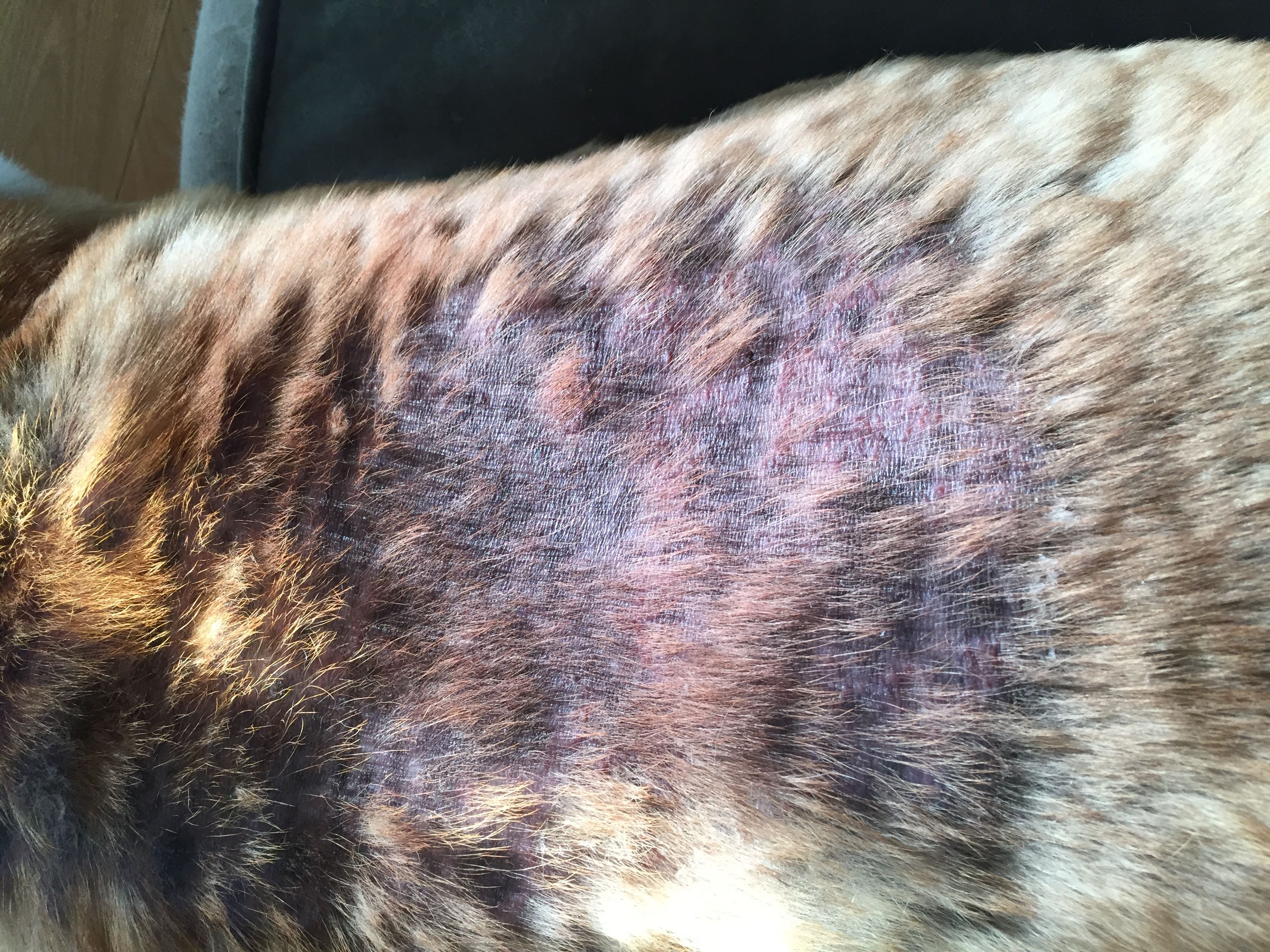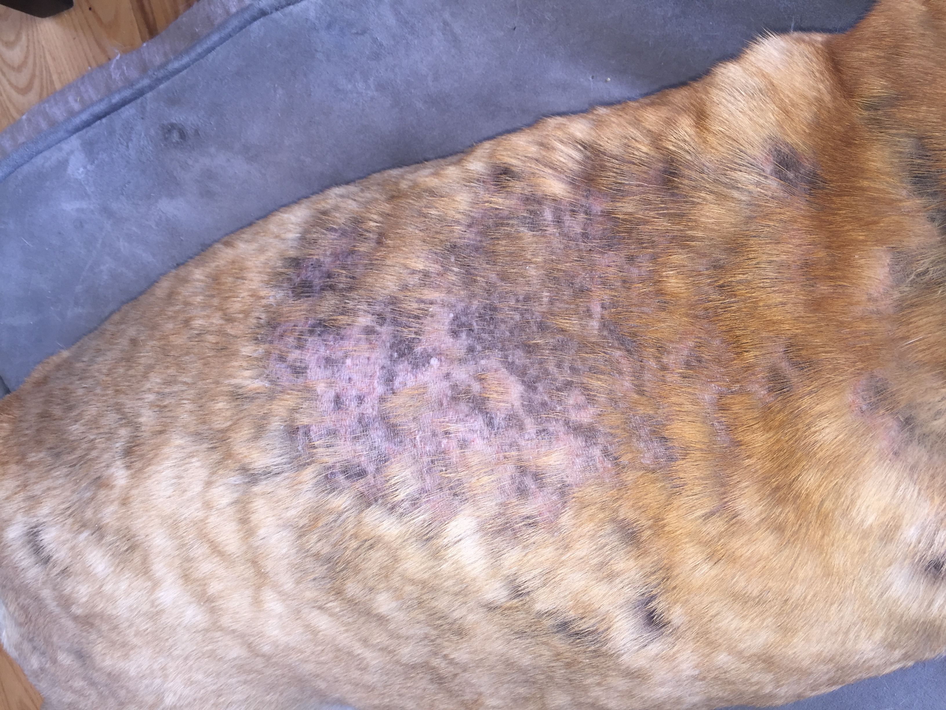 We started Potter on an rx called Apoquel 16mgs 1 to 2 times a day It works wonderful , however it cost about $2.00 a pill. I have found if I get it at Walmart, I can get it for about a 1.50 a pill. Once the skin gets so bad it won't fix where he is, but once you get it cleared up it will work great for allergies that start a lot of this problem. Clindamycin and a type of prednisone that starts with a T . My vet says it works better for animals the Prednisone. It is only for animals I think. I wipe Potters face off with a Norwex cloth. Sometimes if he starts getting a little yeast on his face I use a little Monostat cream and it clears right up. HOPE YOUR BABY GETS BETTER.I am back regarding Bellaās ON GOING āapparent staphā skin infection that she gets one or twice every year usually between December and April. She started showing signs of reoccurring about mid April. The first thing I did was bath her using Nizoral shampoo to kill the bacteria and get the loose hair and scabs off of her and give her some comfort from the itching, I then applied coconut oilI to her bare skin and a week ago I started her on Clavulin C12 (amoxicillin) antibiotic pills, 875mg daily (half a pill after breakfast and half a pill after supper) and 75mg of Benadryl daily (25mg 3 times per day, she is 80lbs). I have been bathing her weekly using the Nizoral shampoo and each time more hair and scabs come off of her, after yesterdayās bath her back has a large area of bare skin, see attached picture (I hope). I havenāt used the coconut oil on her skin after the last two baths, Iām not sure why. Bella gets probiotics (tripe) daily and has been for some time, for years she has been on a small dosage (5mg every 3 days) of Prednisone to keep another issue she has from flaring up. This time on the antibiotics and Benadryl she is much more interested in food then ever before, I am not sure if it is the antibiotics or the Benadryl that is causing her to be hungry, it doesnāt really matter, at this stage I am not concerned about her weight. If anyone can suggest something else I can do or change I am interested View attachment 116355