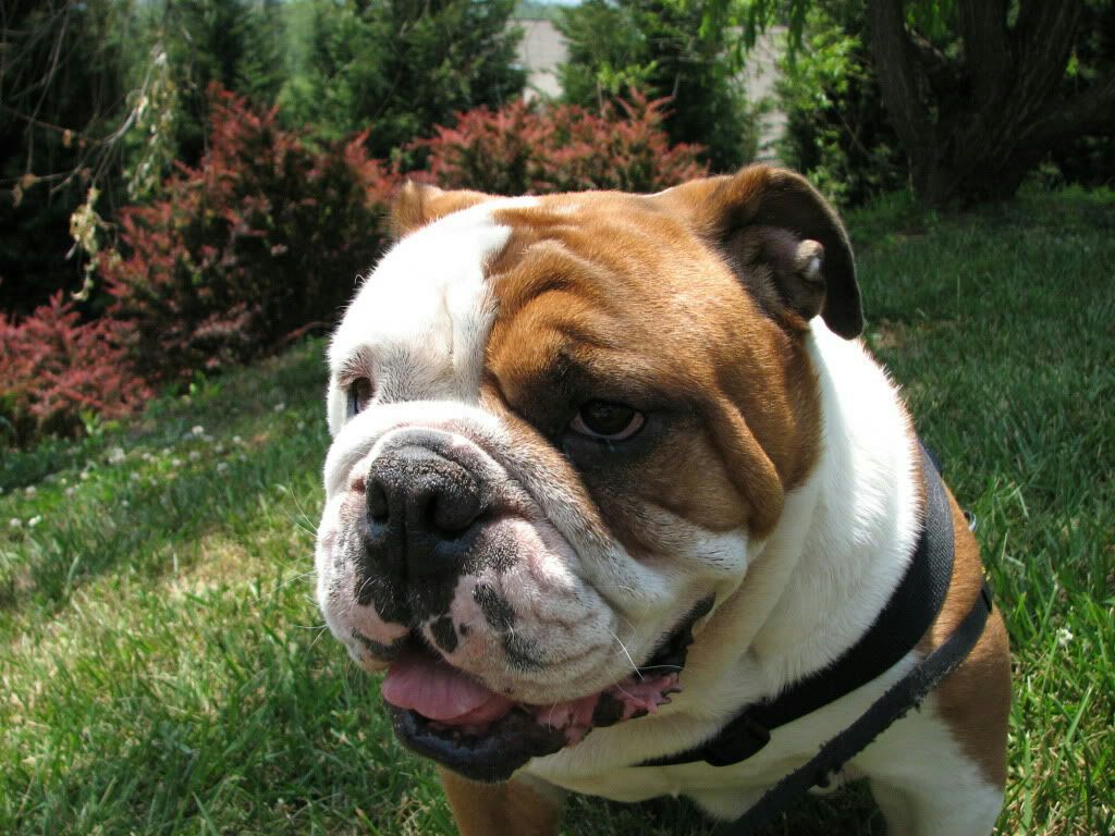 What a handsome fella, you don't see too many dark brindle. I love his bit of white "right where it should be". My boy's Dad is dark brindle and an impressive looking adult male, he is about 65 lbs, but actually on the tall and lean side for an EBD. I only have one pic -