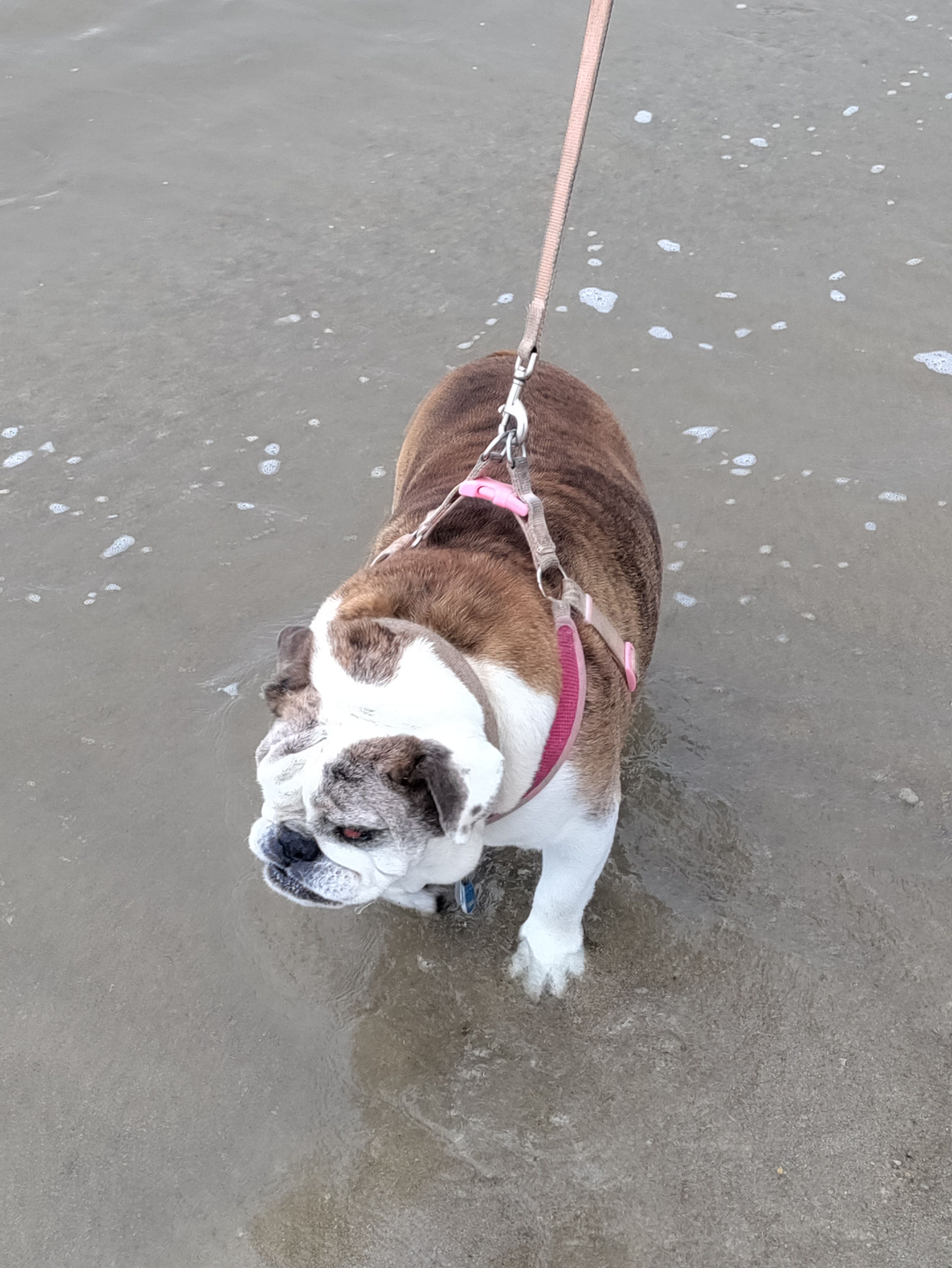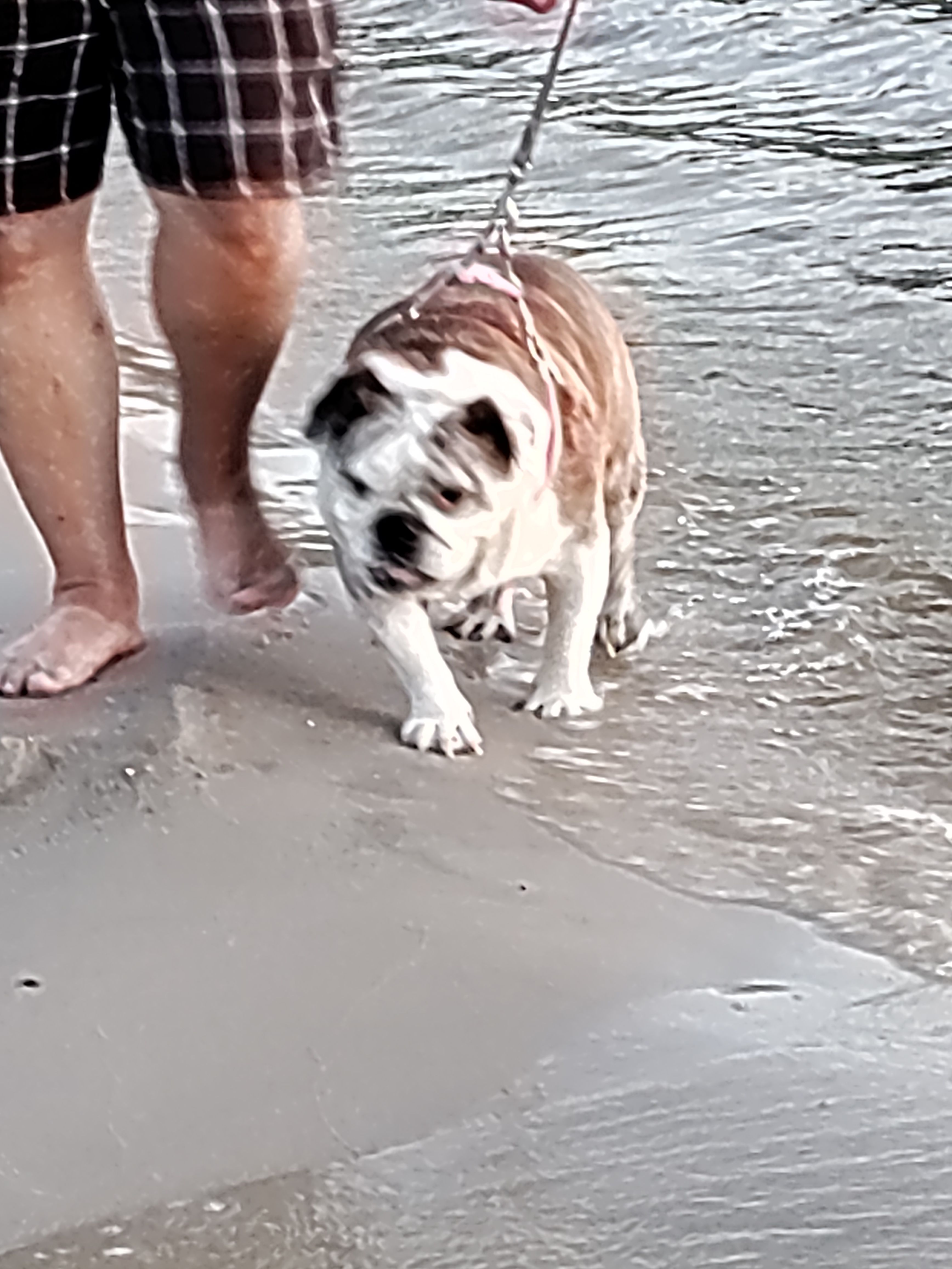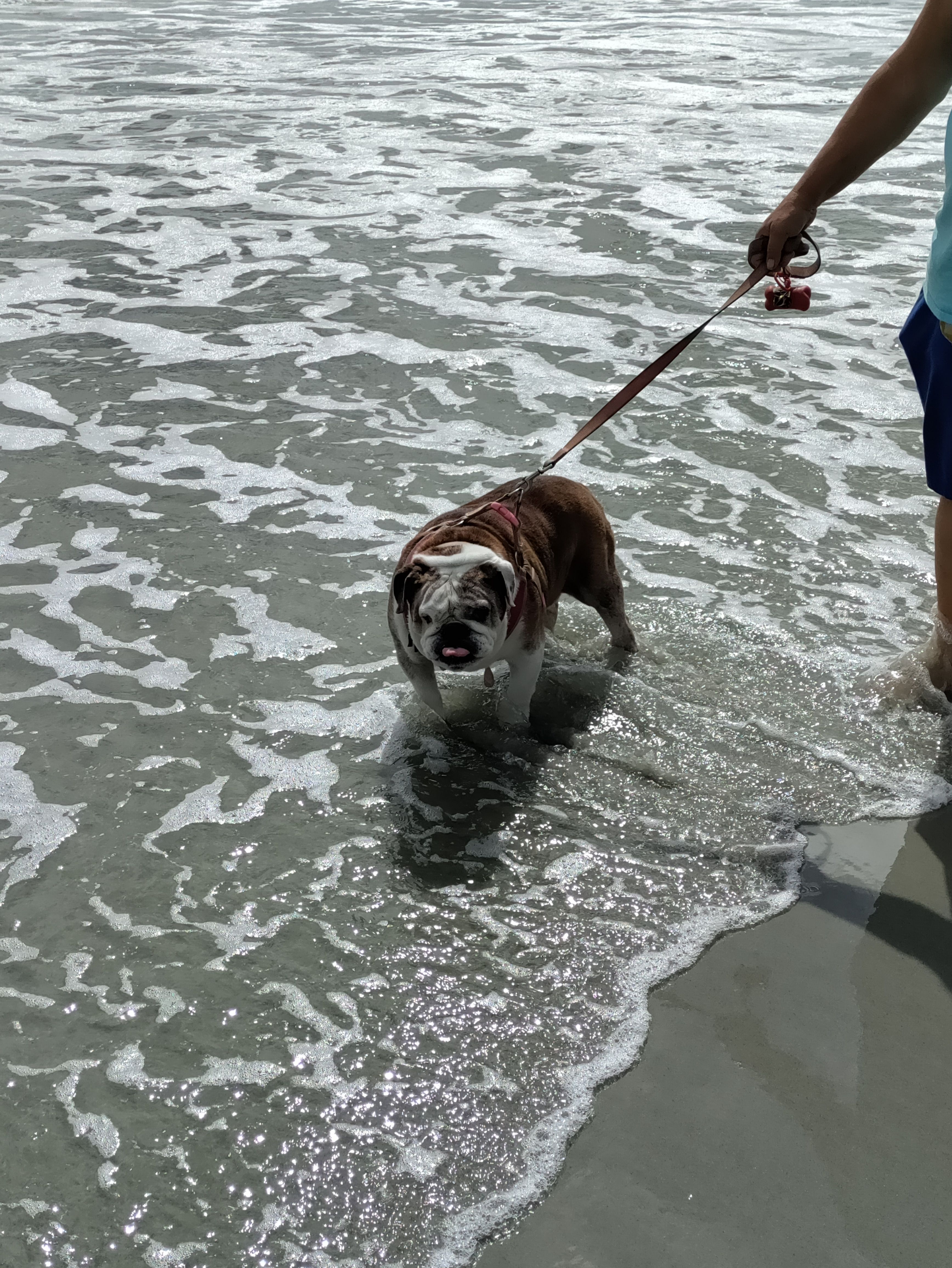 Our 14 1/2 year old English Bulldog Blossom loves the ocean. We live in a suburb of Cleveland, Ohio and since Blossom is a rescue dog, we have no idea of her past life before we fostered her and then adopted her 6 years ago. Shortly after our previous Bulldog passed away, a Bulldog rescue group asked us if we could foster an elderly Bulldog. We were told that she appears to have been used for breeding, has a few medical issues including cherry eye, cataracts & entropion in right eye. 3 different vets estimated her to be 8-9 years old. Our thoughts were to give this dog the best life possible because she probably didn't have much time left. We are avid campers and get to travel often. the first few campgrounds we visited had lakes, blossom liked to wade in the water about 3 - 6 inches deep. Our first trip to Myrtle Beach, blossom pulled me to the ocean, and walked the shoreline, she smiled when splashed by the waves. We have since been to many beaches along the east coast, from the Delaware beaches, Maryland beaches, Virginia beaches, N. Carolina beaches, S. Carolina beaches, Georgia beaches, & Florida beaches. Last month, Blossom wasn't doing well, she kept losing her balance, getting confused inside & outside our home, and losing control of her bladder inside the house (first time ever) Since we celebrated Christmas one week early with our kids & grandchildren, I told my wife that we should take Blossom someplace warm & get her to a beach. All the Florida campgrounds were booked, so I googled warm getaways for the holidays. South Padre Island, Texas came up and I started doing some research. Long story short, We booked a 5 day stay at the Ramada inn resort that was pet friendly for far less than the campgrounds there. Blossom had a blast, got to go to the ocean every day, perfect weather, high 70's - mid 80's. her hip & legs were no longer bothering her, it was a great get away.... If she can hold out a little longer, we will be heading to southern Florida in February.