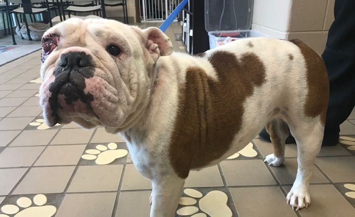 Please welcome Rachel to Lone Star Bulldog Club Rescue. This poor, sweet girl was found wandering the city and picked up by animal control who contacted our group. We think Rachel is about 2 years old. She needs entropion surgery on both eyes. Her left eye was not too bad and it cleaned up easily. Her right eye is twice its size and severely inflamed. You can easily see where an ulcer has perforated the eye. The course of treatment will be to sew the eyelids shut for several days to help the cornea heal without rupturing further. She does appear to still have some vision in that eye. Whether she can regain any more eyesight still needs to be determined. Other than her eyes, she appears to be in pretty good health. Rachel is calm and very sweet. Say some special prayers for this girl as she undergoes her eye surgeries and has everything else checked out.